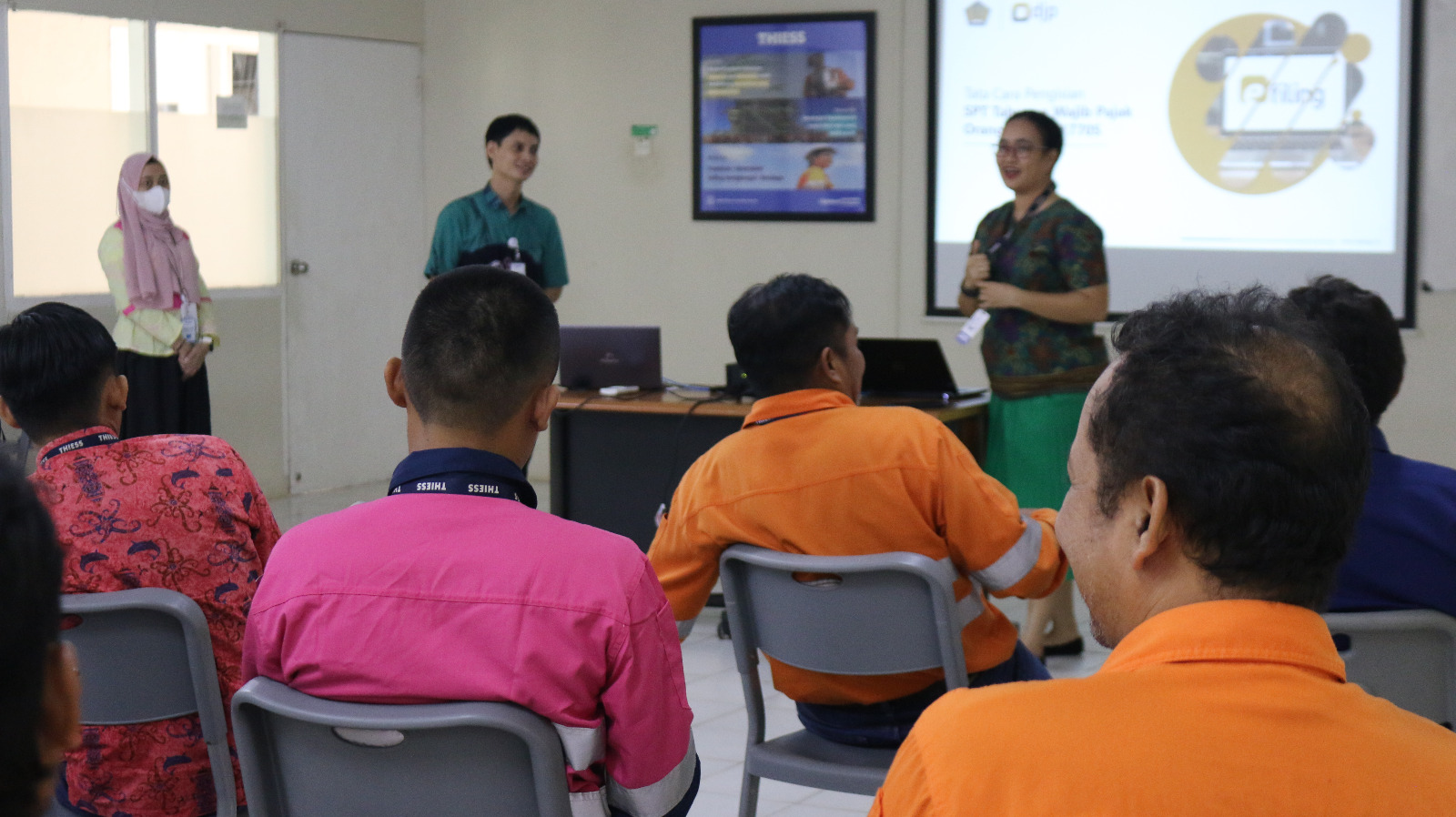 Tim Penyuluh KPP Pratama Balikpapan Timur memberikan edukasi perpajakan mengenai tata cara pelaporan SPT Tahunan Orang Pribadi untuk karyawan PT Thiess Contractors Indonesia di Kota Balikpapan (Jumat, 15/3).