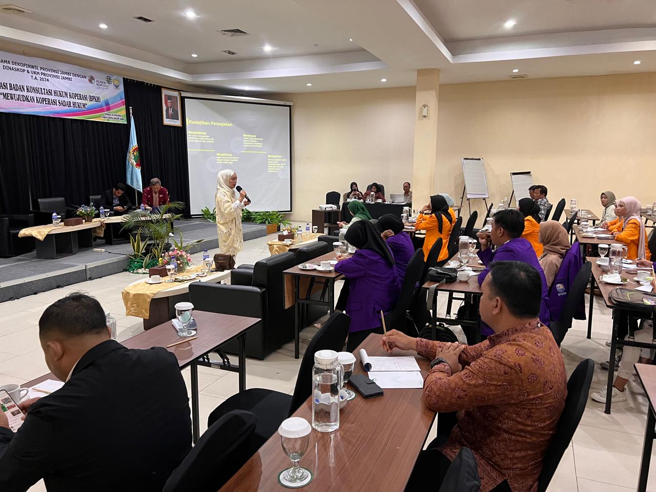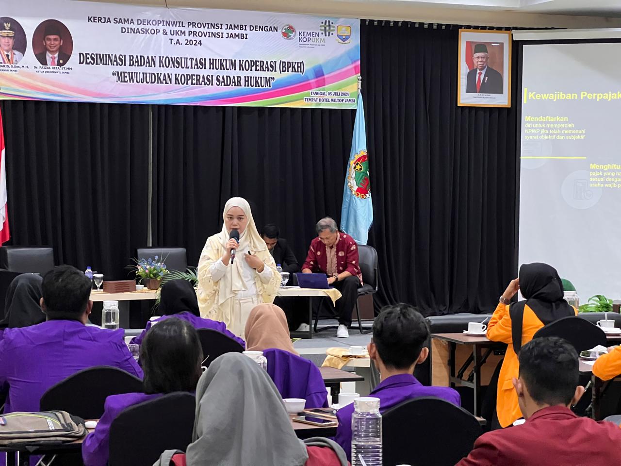 Kantor Pelayanan Pajak (KPP) Pratama Jambi Telanaipura hadir sebagai narasumber dalam kegiatan desiminasi Badan Konsultasi Hukum Koperasi (BPKH) yang diselenggarakan oleh Dewan Koperasi Indonesia (Dekopin) wilayah provinsi Jambi yang bekerja sama dengan Dinas Koperasi, Usaha Kecil dan Menengah (Diskop UKM) Provinsi Jambi di Hotel Wiltop Kota Jambi (Jumat, 5/7). Acara dengan tema “Mewujudkan Koperasi Sadar Hukum” tersebut dihadiri oleh anggota koperasi di wilayah Provinsi Jambi.