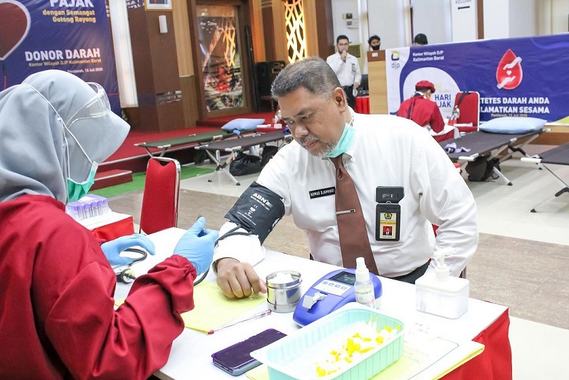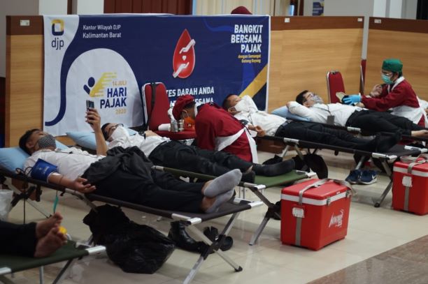Bekerja sama dengan PMI Pontianak, Kanwil DJP Kalimantan Barat menyelenggarakan kegiatan donor darah di Aula Kanwil DJP Kalimantan Barat, Pontianak (Senin, 13/7). Kepala Kanwil DJP Kalbar Ahmad Djamhari ikut mendonorkan darahnya diikuti oleh 57 pegawai di lingkungan Kementerian Keuangan Kalimantan Barat.