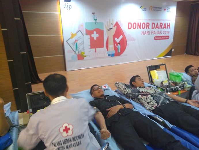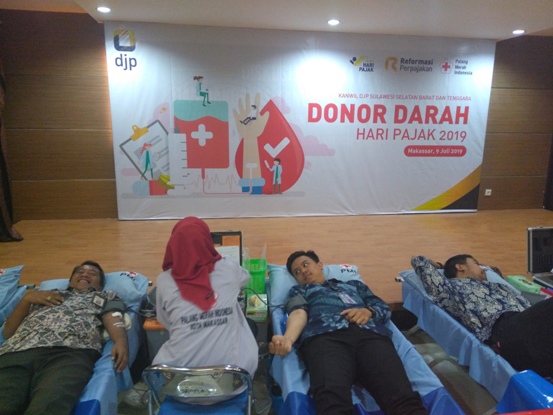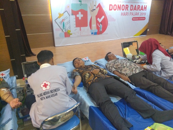 Kantor Pelayanan Pajak (KPP) Madya Makassar bersama unit kerja lain di Gedung Keuangan Negara Makassar melangsungkan acara Bakti Sosial Donor Darah sebagai salah satu rangkaian acara memperingati Hari Pajak 2019 (Selasa, 9/7). Kegiatan ini diadakan di aula Kanwil DJP Sulawesi Selatan, Barat, dan Tenggara yang sekaligus menjadi penyelanggara kegiatan donor darah ini.