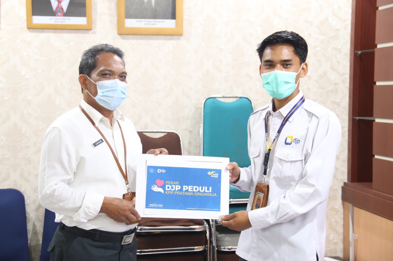 Bertempat di ruang rapat KPP Pratama Singaraja, Arjuna Sianipar, Kepala Subbagian Umum dan Kepatuhan Internal menyerahkan sumbangan berupa uang tunai kepada PPNPN.