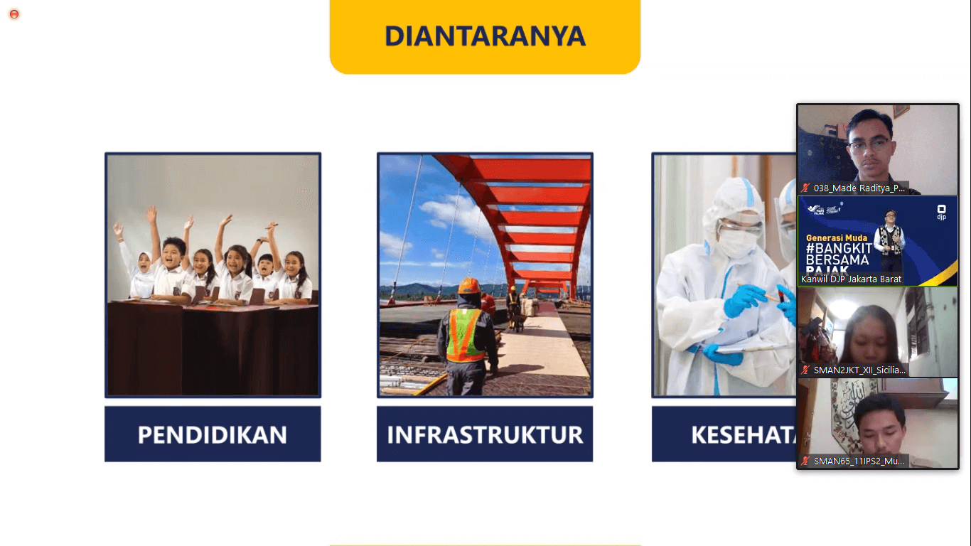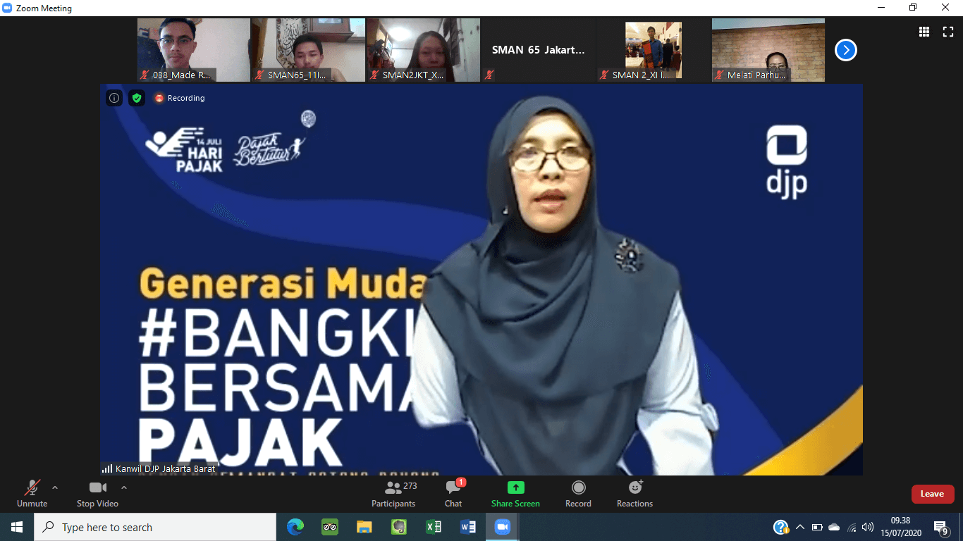 Dalam rangka memperingati Hari Pajak yang jatuh pada tanggal 14 Juli, KPP Madya Jakarta Barat mengikuti acara Pajak Bertutur yang diadakan oleh Kantor Wilayah DJP Jakarta Barat bersama 32 peserta dari SMAN 33 Jakarta dan SMAN 65 Jakarta (Rabu, 14/7). Kali ini Pajak Bertutur dilakukan secara daring oleh Kantor Wilayah DJP Jakarta Barat bersama 10 Kantor Pajak lainnya di wilayah Jakarta Barat melalui aplikasi Zoom guna mencegah penyebaran Covid-19.