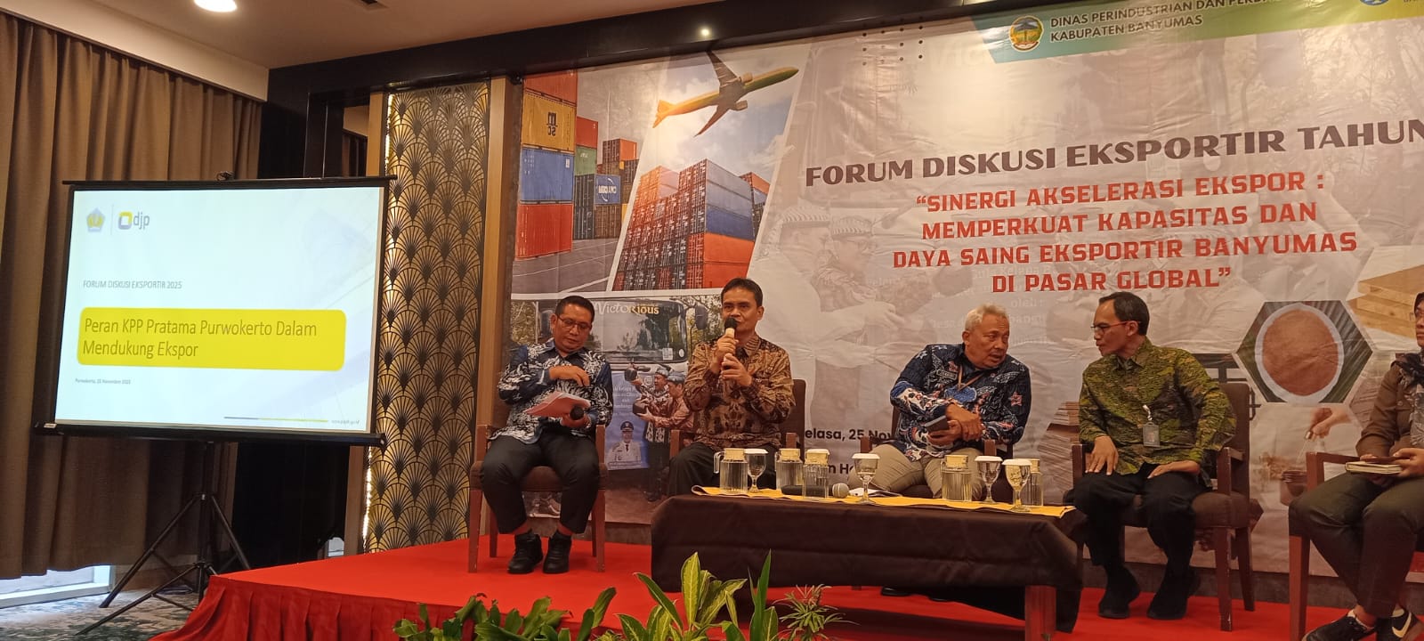 Kantor Pelayanan Pajak (KPP) Pratama Purwokerto menjadi salah satu narasumber dalam acara Forum Diskusi Eksportir Tahun 2025 di Hotel Aston Purwokerto, Kabupaten Banyumas, Jawa Tengah (Selasa, 25/11).