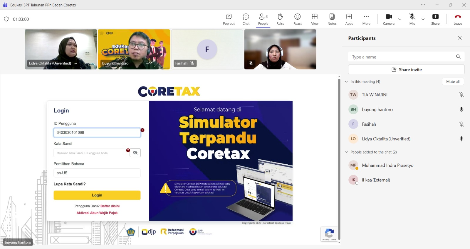 Para Penyuluh Pajak yang bertugas menyampaikan bahwa kegiatan ini merupakan bagian dari strategi DJP dalam mendukung digitalisasi layanan perpajakan. “Kami ingin memastikan bahwa Wajib Pajak Badan memiliki pemahaman yang memadai dalam menggunakan sistem Coretax DJP. Dengan edukasi yang dilakukan secara daring, kami dapat menjangkau lebih banyak peserta secara efisien dan interaktif,” ujarnya.