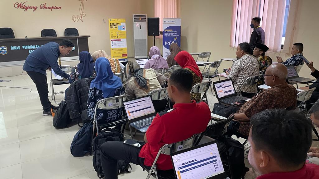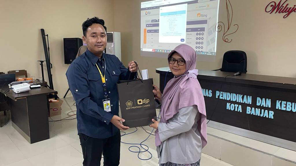 Kantor Pelayanan Penyuluhan dan Konsultasi Perpajakan (KP2KP) Banjar memberikan asistensi langsung pemadanan Nomor Induk Kependudukan (NIK) sebagai Nomor Pokok Wajib Pajak (NPWP) dan pelaporan SPT Tahunan kepada perwakilan guru dan ASN Sekolah Dasar Negeri (SDN) se-Kecamatan Pataruman di Aula Dinas Pendidikan dan Kebudayaan Kota Banjar (Kamis, 9/2). Kegiatan yang berlangsung selama 60 menit ini diikuti 27 perwakilan sekolah di wilayah Kota Banjar.
