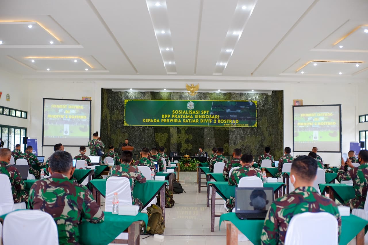 Kantor Pelayanan Pajak (KPP) Pratama Singosari mengadakan Edukasi Tata Cara Pelaporan SPT Tahunan melalui e-Filing kepada anggota TNI Divisi Infanteri 2 Kostrad di Gedung Sandoyo Madivif 2 Kostrad, Malang (Selasa, 23/2).