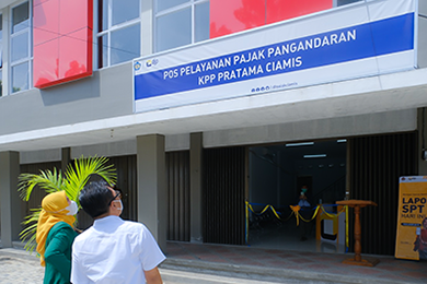 Kepala Kanwil DJP Jawa Barat I Erna Sulistyowati didampingi oleh Kepala KPP Pratama Ciamis Yuddi Hariyanto meresmikan Pos Pelayanan Pangandaran yang baru di Babakan, Pangandaran (Kamis, 1/4).