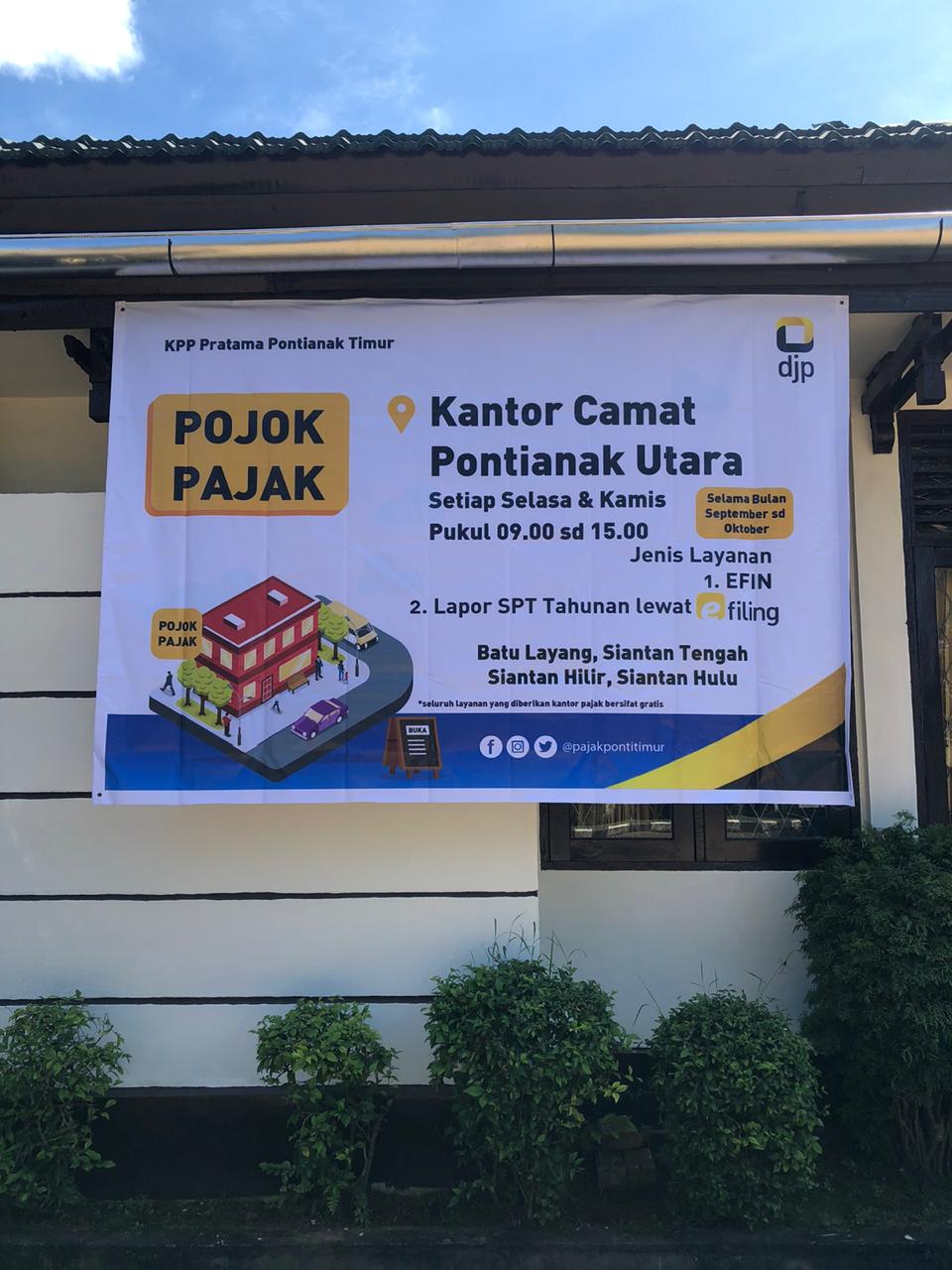 KPP Pratama Pontianak Timur buka Pojok Pajak di Kantor Camat Pontianak Utara (Rabu, 30/9). Kegiatan ini merupakan bentuk sinergi antara KPP Pratama Pontianak Timur dengan Pemerintah Daerah dalam hal ini Camat Pontianak Utara. Pojok Pajak dibuka tiap Selasa dan Kamis, dimulai dari pukul 09.00 WIB hingga 15.00 WIB dan bertempat di depan Kantor Camat Pontianak Utara.