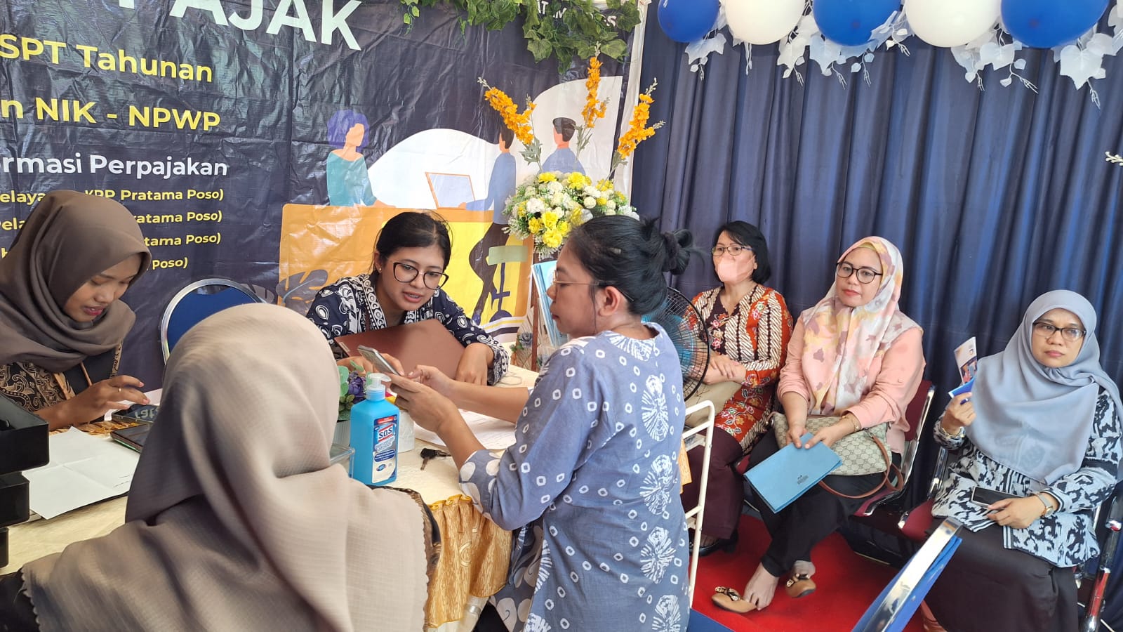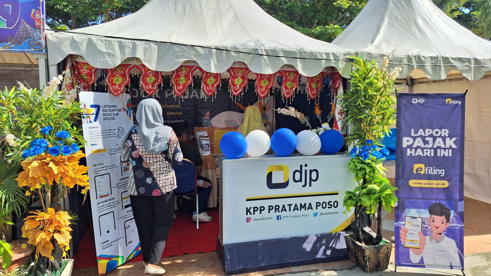 Tika, wajib pajak yang berkunjung, menyampaikan ucapan terima kasih karena Kantor Pajak Poso hadir memberikan layanan asistensi pelaporan SPT Tahunan di tengah kemeriahan acara HUT Ke-129 Kabupaten Poso.