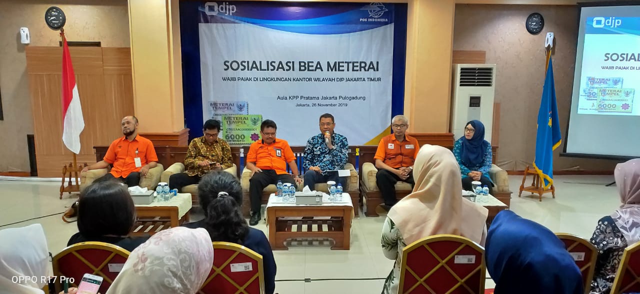 Sebagai upaya dalam memberantas peredaran meterai ilegal termasuk meterai bekas pakai dan meterai palsu, Kantor Wilayah DJP Jakarta Timur bersama PT Pos Indonesia menggelar sosialisasi tentang Bea Meterai di Aula KPP Pratama Jakarta Pulogadung (Selasa, 26/11). Acara sosialisasi ini diikuti oleh sekitar 75 wajib pajak yang terdaftar di Kantor Wilayah DJP Jakarta Timur yang tergolong sebagai pengguna meterai dalam jumlah besar.