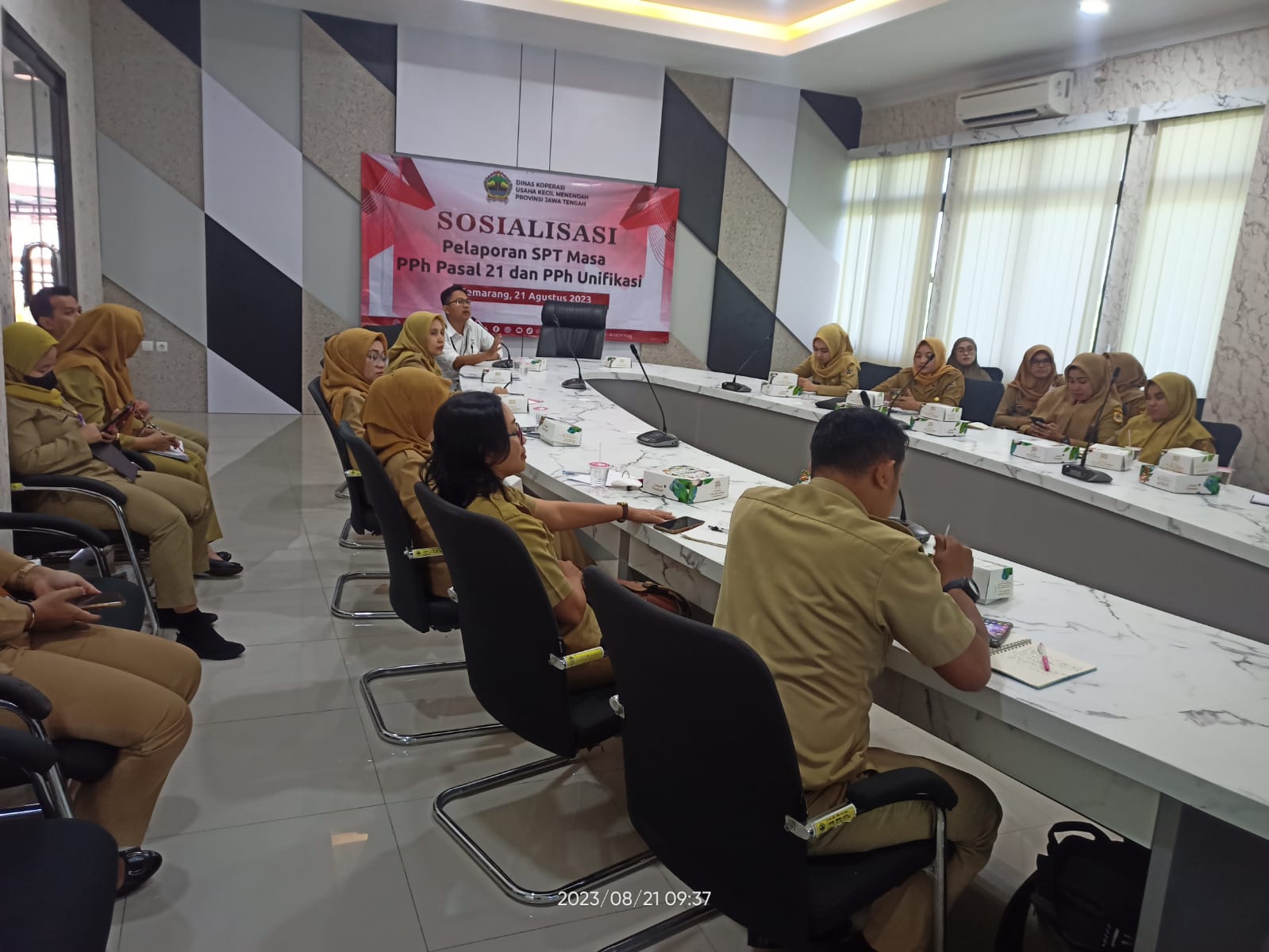 Kantor Pelayanan Pajak (KPP) Pratama Semarang Candisari bekerja sama dengan Dinas Koperasi Usaha Kecil dan Menengah (UKM) Provinsi Jawa Tengah mengadakan sosialisasi kewajiban pelaporan Surat Pemberitahuan (SPT) Masa Pajak Penghasilan (PPh) pasal 21 dan e-Bupot Unifikasi Instansi Pemerintah secara tatap muka di Aula Arjuna Dinas Koperasi dan UKM Provinsi Jawa Tengah, Kota Semarang (Senin, 21/8).