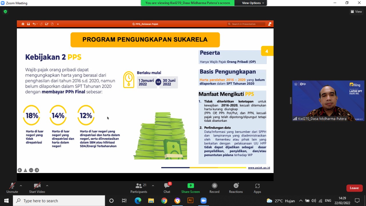 Dalam kegiatan ini, penyampaian materi dibagi menjadi dua sesi. Pada sesi pertama, Melva menyampaikan mengenai materi terkait Undang-Undang Nomor 7 Tahun 2021 tentang Harmonisasi Peraturan Perpajakan (UU HPP) beserta dengan perubahan-perubahan pada ketentuan perpajakan yang disebabkan terbitnya UU HPP tersebut. Pada sesi kedua, Dasa menyampaikan materi terkait Program Pengungkapan Sukarela (PPS) dan tidak lupa mengingatkan kepada para relawan pajak untuk menyebarluaskan informasi terkait PPS ini kepada masyarakat.
