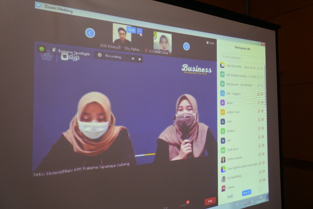 Kantor Pelayanan Pajak (KPP) Pratama Surabaya Gubeng menyelenggarakan Kegiatan Business Development Services (BDS) secara daring melalui aplikasi Zoom Cloud Meeting di Ruang Penyuluhan Lantai 2 KPP Pratama Surabaya Gubeng (Kamis, 9/9). Acara ini diselenggarakan dalam rangka mendukung pengembangan usaha yang dilakukan oleh para pelaku Usaha Mikro, Kecil, dan Menengah (UMKM) khususnya pada masa pandemi Covid-19.