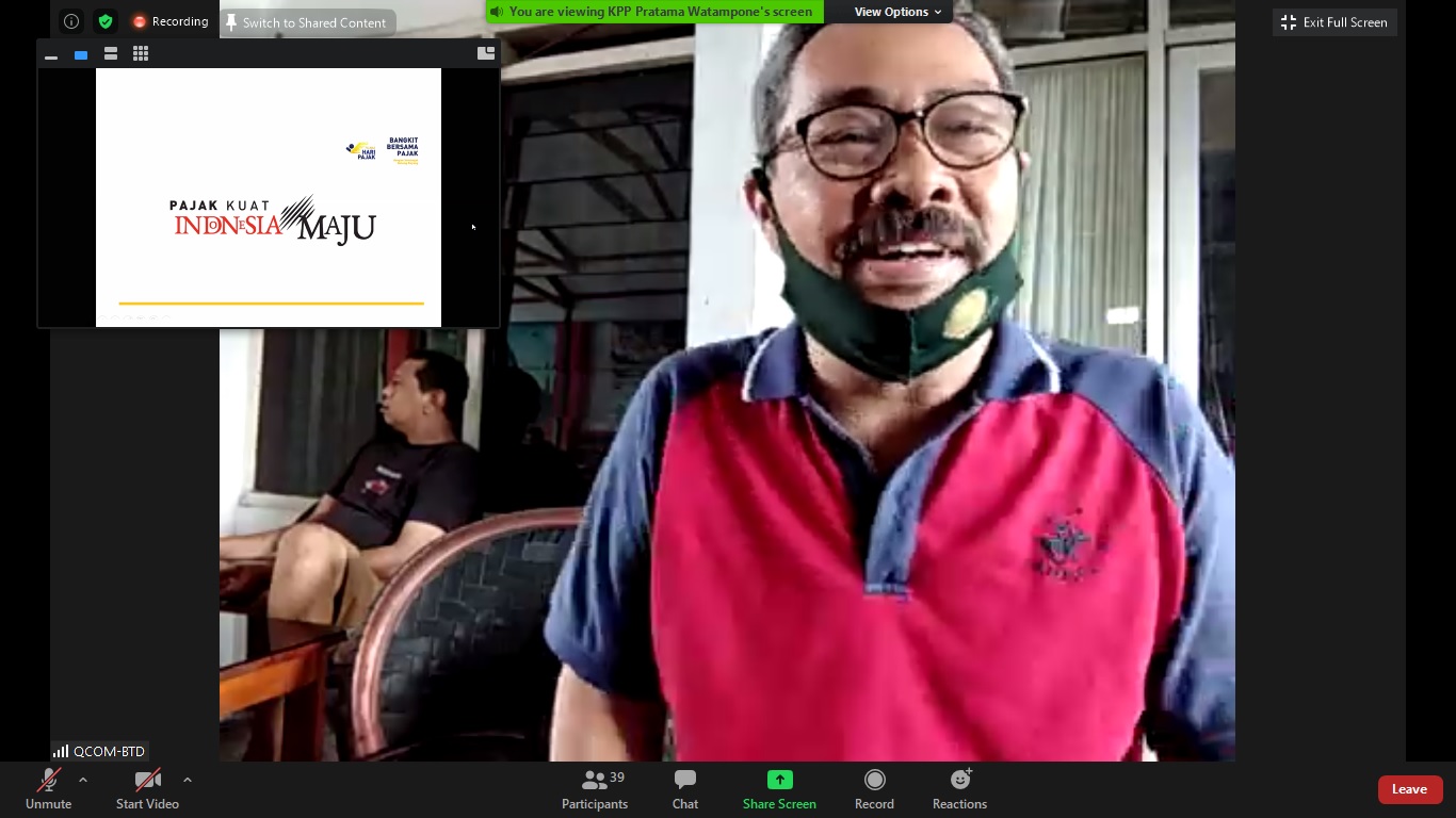 Kantor Pelayanan, Penyuluhan, dan Konsultasi Perpajakan (KP2KP) Watansoppeng di Kabupaten Soppeng menggelar sosialisasi Peraturan Menteri Keuangan Nomor 86/PMK.03/2020 tentang Insentif Pajak untuk Wajib Pajak Terdampak Pandemi Covid-19 secara daring melalui aplikasi zoom meeting (Selasa, 22/9).