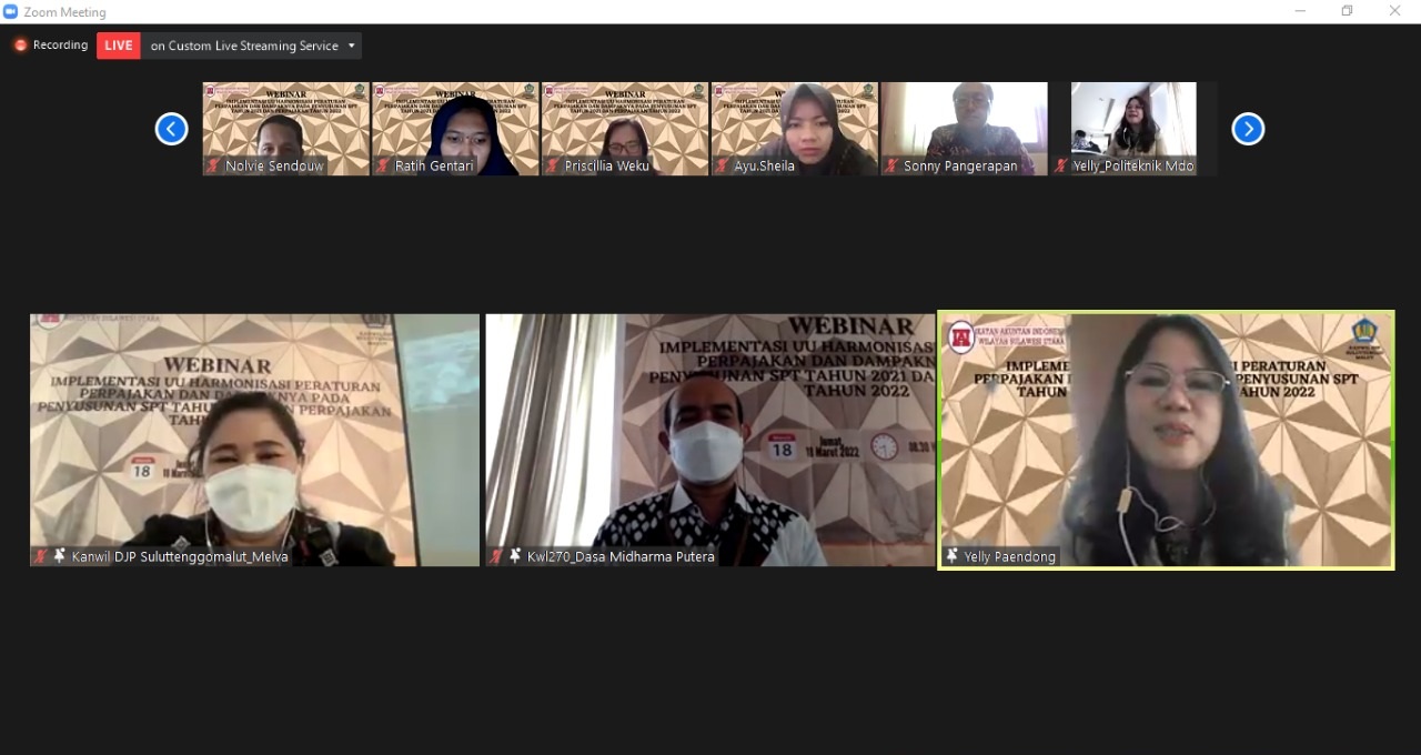 Kegiatan tersebut mengambil tema Implementasi Undang-Undang Harmonisasi Peraturan Perapajakan (UU HPP) pada Penyusunan dan Pelaporan Surat Pemberitahuan (SPT) Tahunan. Dalam kegiatan ini dihadiri ratusan peserta yang merupakan anggota IAI Wilayah Sulawesi Utara secara daring maupun luring.