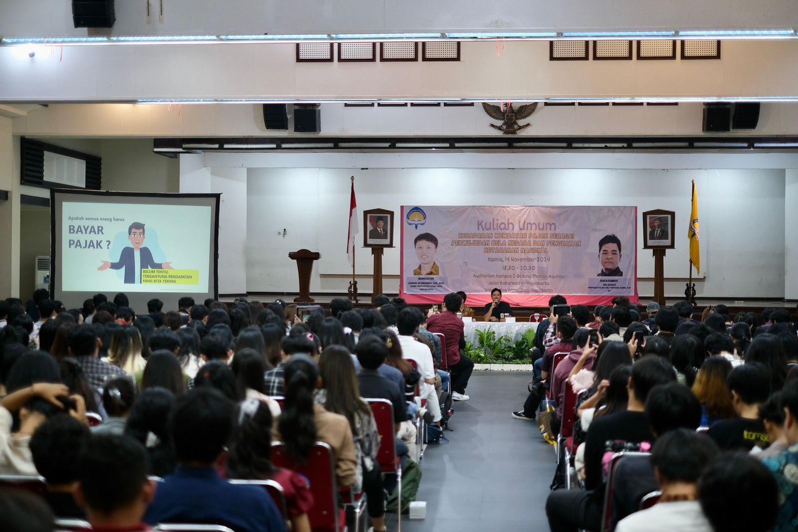 Kanwil Direktorat Jenderal Pajak Daerah Istimewa Yogyakarta (Kanwil DJP DIY) menggandeng Universitas Atma Jaya Yogyakarta (UAJY) dalam menyelenggarakan kuliah umum bertema Kesadaran Membayar Pajak Sebagai Perwujudan Bela Negara & Penguatan Ketahanan Nasional di Auditorium Kampus II UAJY, Yogyakarta (Kamis, 14/11).