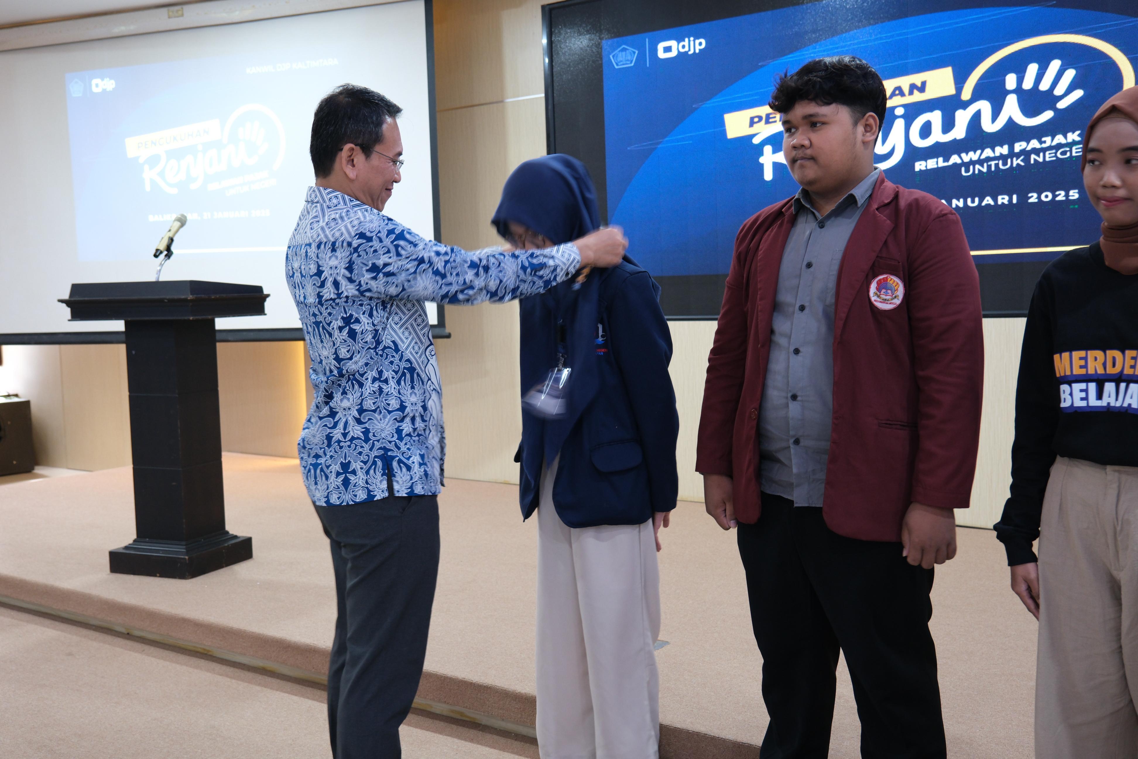 Kepala Kanwil DJP Kaltimtara, Heru Narwanta, membuka kegiatan ini dan secara simbolis mengalungkan tanda pengenal kepada dua perwakilan Renjani.