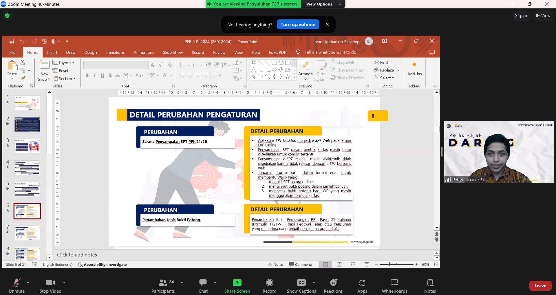 “Selamat pagi Bapak Ibu sekalian, di kelas pajak kali ini kita akan membahas Peraturan Direktur Jenderal Pajak Nomor PER-2/PJ/2024 tentang bentuk dan tata cara pembuatan bukti pemotongan Pajak Penghasilan (PPh) Pasal 21 dan PPh Pasal 26 serta bentuk, isi, tata cara pengisian, serta tata cara penyampaian Surat Pemberitahuan (SPT) Masa PPh 21/26 yang akan disampaikan oleh para Asisten Penyuluh Pajak Kantor Pelayanan Pajak (KPP) Pratama Tanjung Redeb,” jelas Dewi Setya Swaranurani selaku pegawai KPP Tanjung Redeb yang sedang bertugas sebagai pembawa acara kelas pajak daring melalui aplikasi Zoom Meeting ini. Kegiatan yang dilaksanakan selama dua jam ini berlokasi di KPP Pratama Tanjung Redeb, Jalan Jenderal Sudirman No 104, Pamusian, Tarakan Tengah, Kota Tarakan, Kalimantan Utara (Jumat, 16/2).