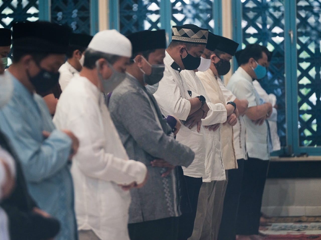 Menteri Keuangan Sri Mulyani Indrawati bersama Direktur Jenderal Pajak Suryo Utomo melaksanakan salat iduladha di Masjid Salahuddin, Kantor Pusat Direktorat Jenderal Pajak, Jakarta (31/7). Pelaksanaan salat id tetap menjaga protokol kesehatan seperti memakai masker dan menjaga jarak.