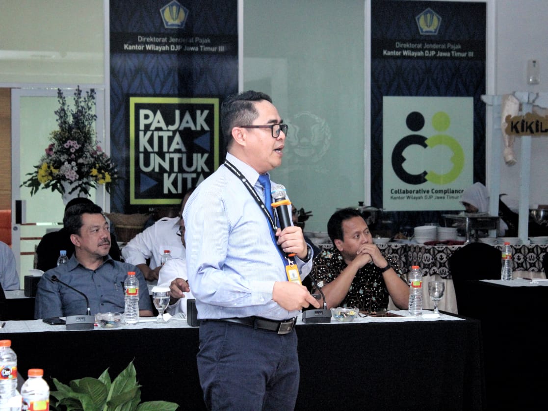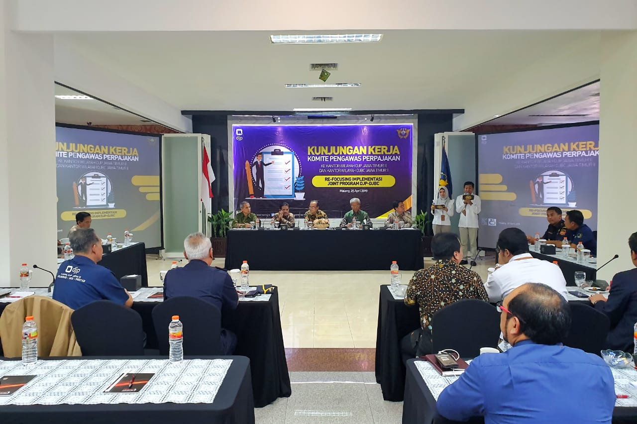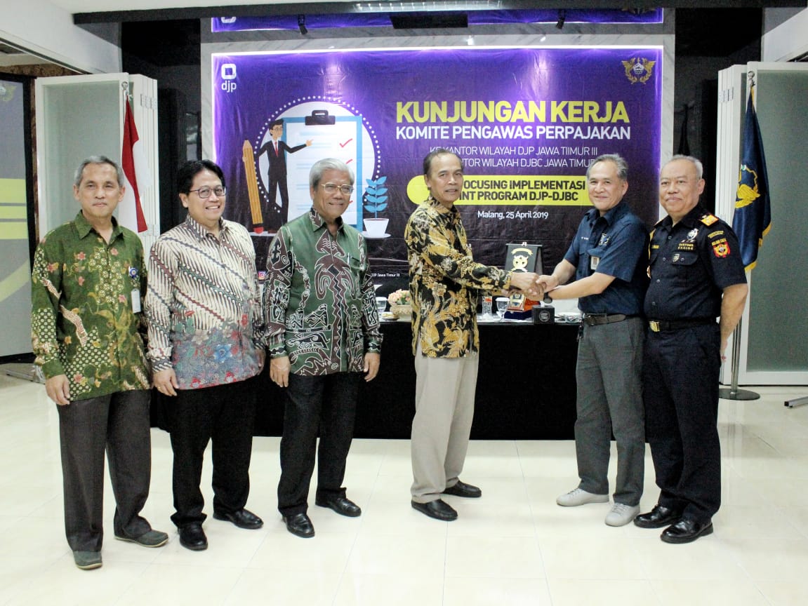 Kanwil DJP Jawa Timur III dan Kanwil DJBC Jawa Timur II mendapat menerima kunjungan kerja dari Komite Pengawas (Komwas) Perpajakan dalam rangka Re-focusing Implementasi Joint Program DJP-DJBC di lobi gedung Kanwil DJP Jawa Timur III kamis (25/4).