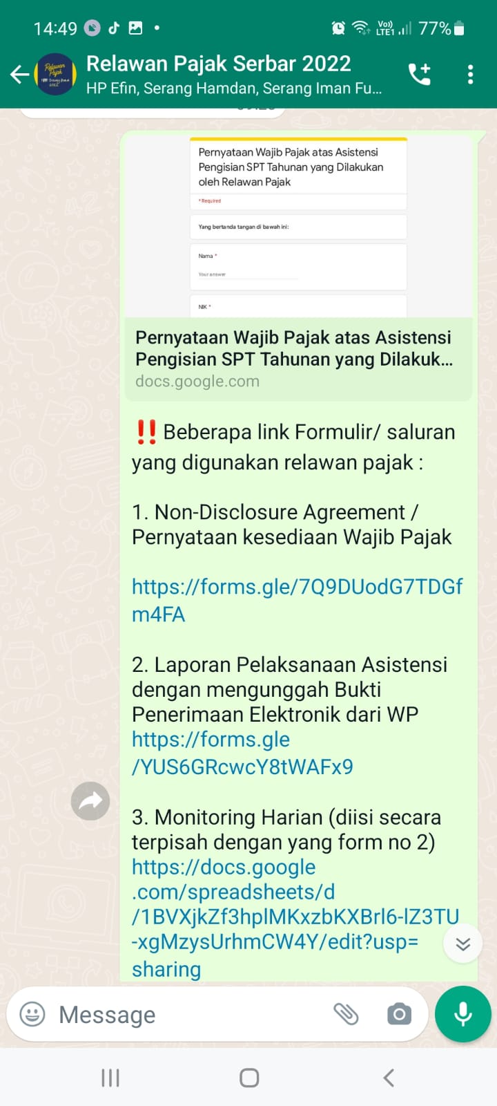 Hal lain yang dilakukan adalah membuat WhatsApp grup relawan yang disana di share atas alur asistensi, beberapa FAQ dari kode gangguan atas djponline serta kumpulan video tutorial terkait layanan online DJP. Hal ini dilakukan untuk lebih menjaga dan melindungi serta mengawasi Relawan Pajak atas hal-hal yang tidak diinginkan, sehingga kegiatan relawan pajak berjalan lebih lancar dan kepatuhan SPT Tahunan meningkat.