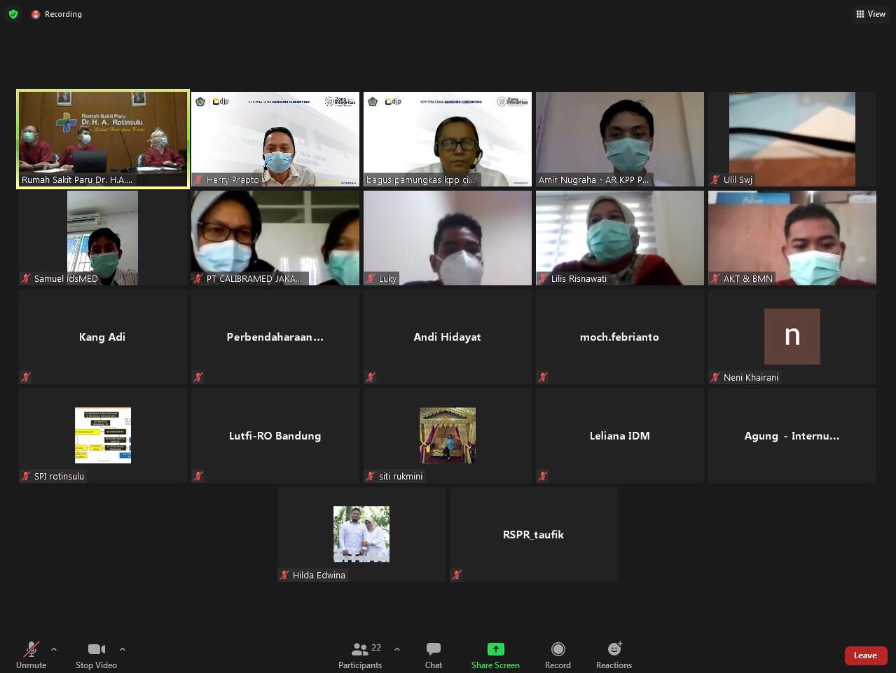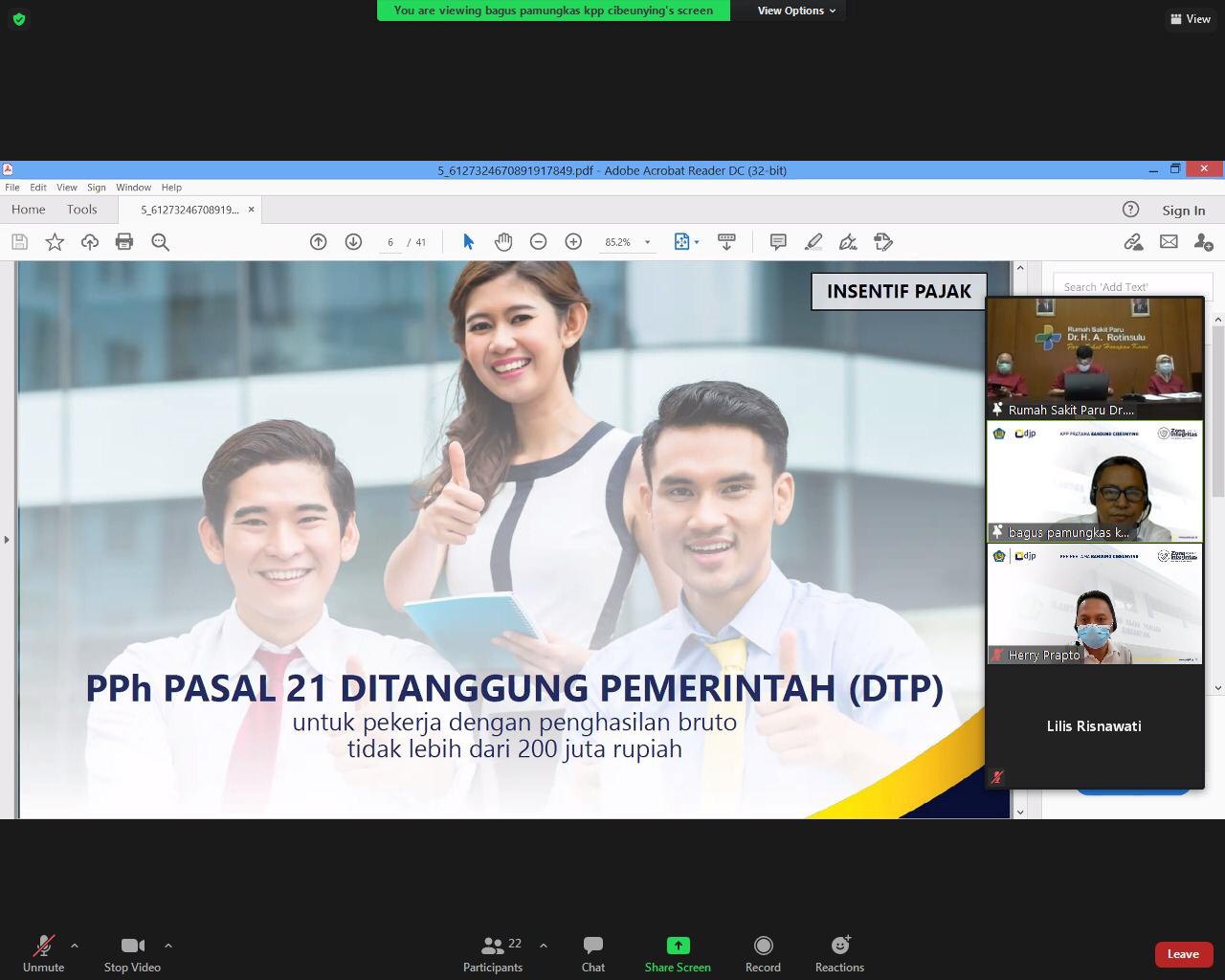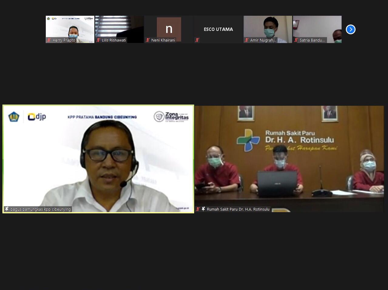 Kantor Pelayanan Pajak (KPP) Pratama Bandung Cibeunying bersama RS Paru Dr. H. A. Rotinsulu menggelar Dialog Insentif Perpajakan secara daring di Bandung (Senin, 3/5). Kegiatan yang diikuti oleh 22 peserta tersebut menghadirkan Penyuluh Pajak Bagus Pamungkas dan Herry Prapto serta Account Representative Amir Nugraha sebagai narasumber.
