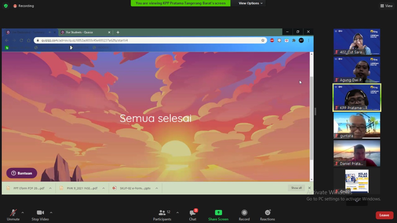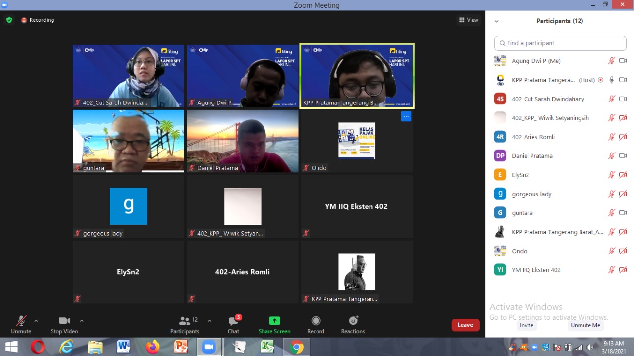 Kantor Pelayanan Pajak (KPP) Pratama Tangerang Barat mengadakan kegiatan kelas pajak untuk Wajib Pajak Orang Pribadi Non Karyawan melalui Zoom Meeting di Tangerang (Kamis, 18/3). Pada kesempatan kali ini, yang bertindak sebagai pemateri adalah Account Representative Cut Sarah dan Account Representative Agung Dwi Pambudi.