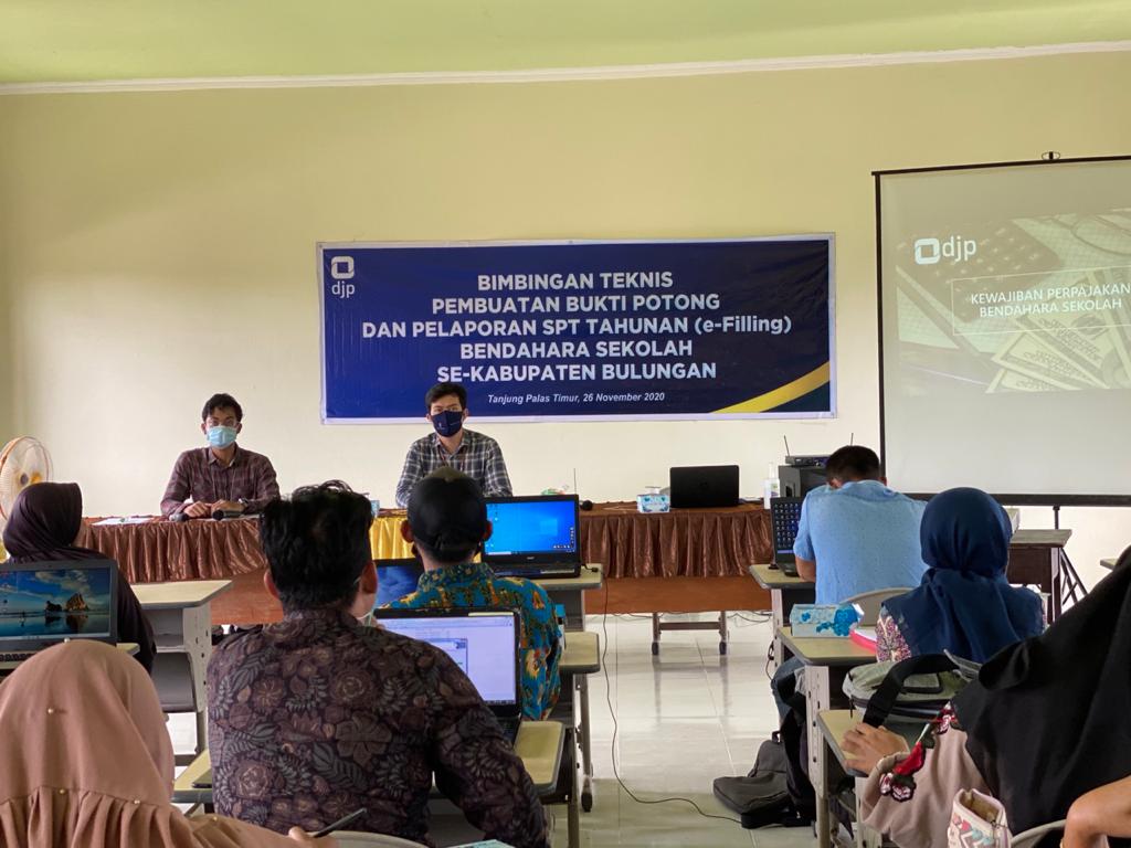 Kantor Pelayanan Pajak (KPP) Mikro Tanjung Selor mengadakan penyuluhan dan bimbingan teknis tentang pembuatan bukti potong dan tata cara pelaporan SPT Tahunan untuk Orang Pribadi kepada bendahara SD dan SMP di seluruh Kecamatan Tanjung Palas Timur Kabupaten Bulungan (Kamis, 26/11).
