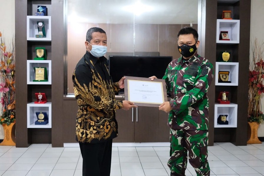 Faisal Alami Kepala Seksi Pelayanan KPP Pratama Samarinda Ilir menyerahkan langsung piagam penghargaan kepada Dandim 0901/Samarinda, Kolonel Inf Oni Kristiyono Goendong.