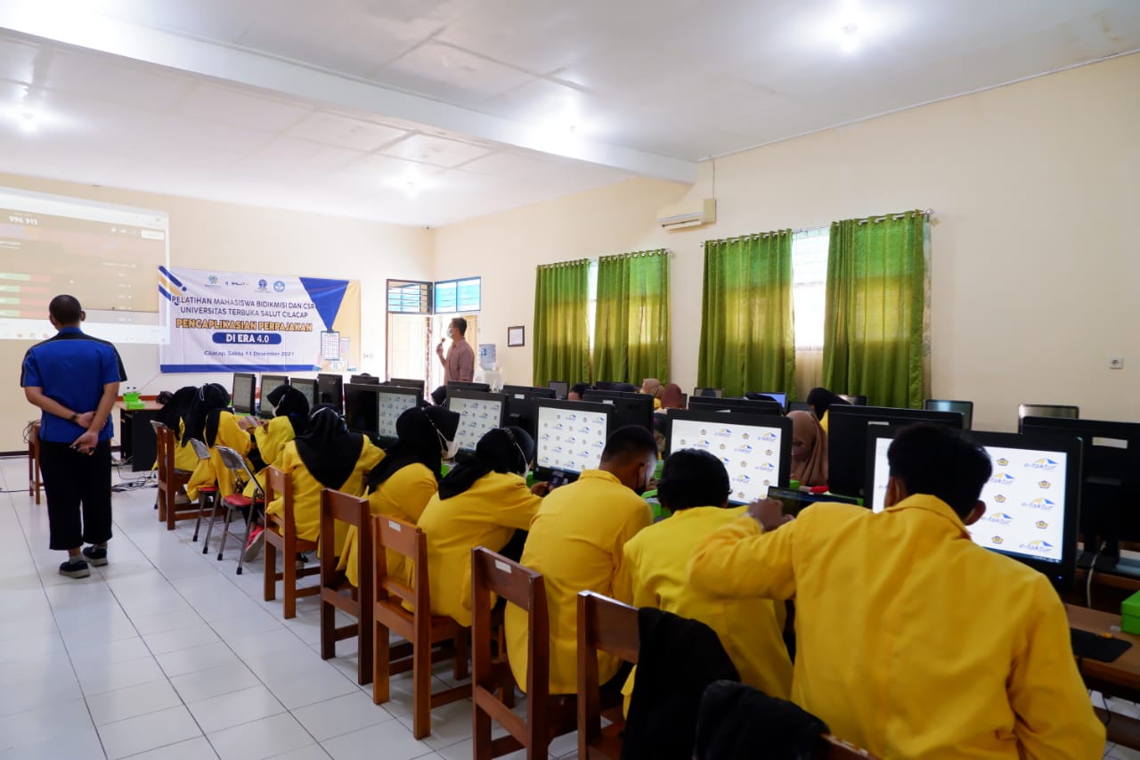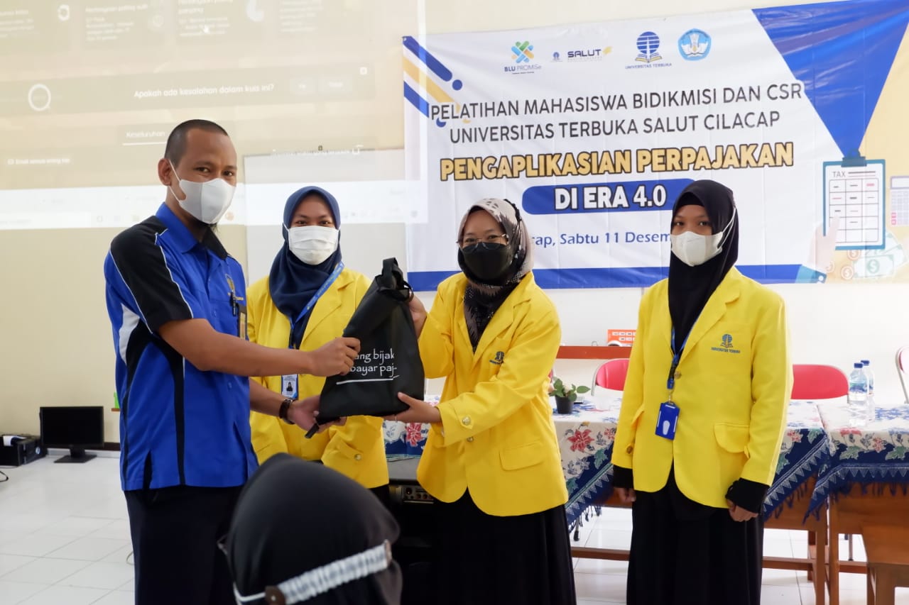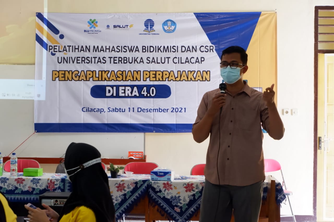Tim Penyuluh Pajak Kantor Pelayanan Pajak (KPP) Pratama Cilacap Rakhmat Hidayat dan Muhammad Najib Amrullah memberikan edukasi perpajakan kepada mahasiswa Universitas Terbuka Sentra Layanan UT (SALUT) di Ruang Laboratorium Komputer SMP Negeri 5 Cilacap, Cilacap (Sabtu, 11/12).