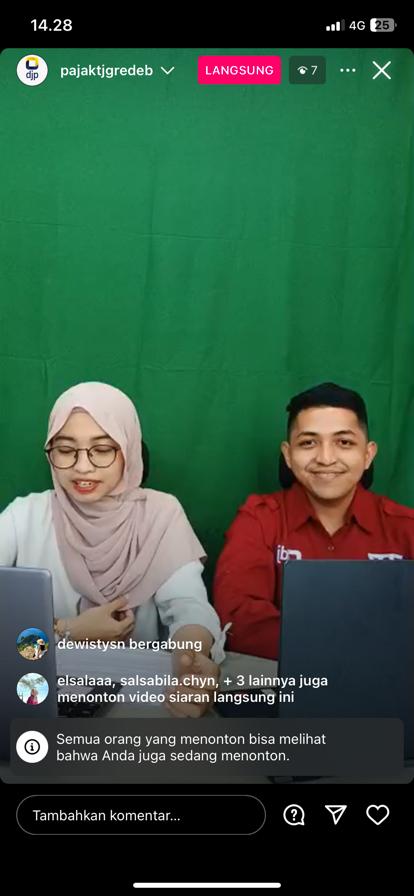 “Selamat sore Kawan Pajak. Pada sore hari ini kita akan membahas tentang aturan terbaru Peraturan Menteri Keuangan (PMK) Nomor 136 tahun 2023 tentang Nomor Pokok Wajib Pajak (NPWP) Orang Pribadi (OP), Badan, dan Instansi Pemerintah serta Pelaporan Surat Pemberitahuan (SPT) Tahunan Orang Pribadi secara online. Saat ini hingga 31 Maret 2024 nanti merupakan waktu untuk menyampaikan pelaporan SPT Tahunan untuk Wajib Pajak Orang Pribadi. Di dalam siaran langsung Instagram ini kawan pajak semua bisa mendapatkan informasi yang lebih lengkap bagaimana cara menyampaikan SPT Tahunan Orang Pribadi,” ungkap Salsabila Cahyani selaku pembawa acara siaran langsung Instagram. Siaran langsung ini dilaksanakan di Kantor Pelayanan Pajak (KPP) Pratama Tanjung Redeb, Jalan Jenderal Sudirman No 104, Tarakan Tengah, Kota Tarakan, Kalimantan Utara (Selasa, 20/2).