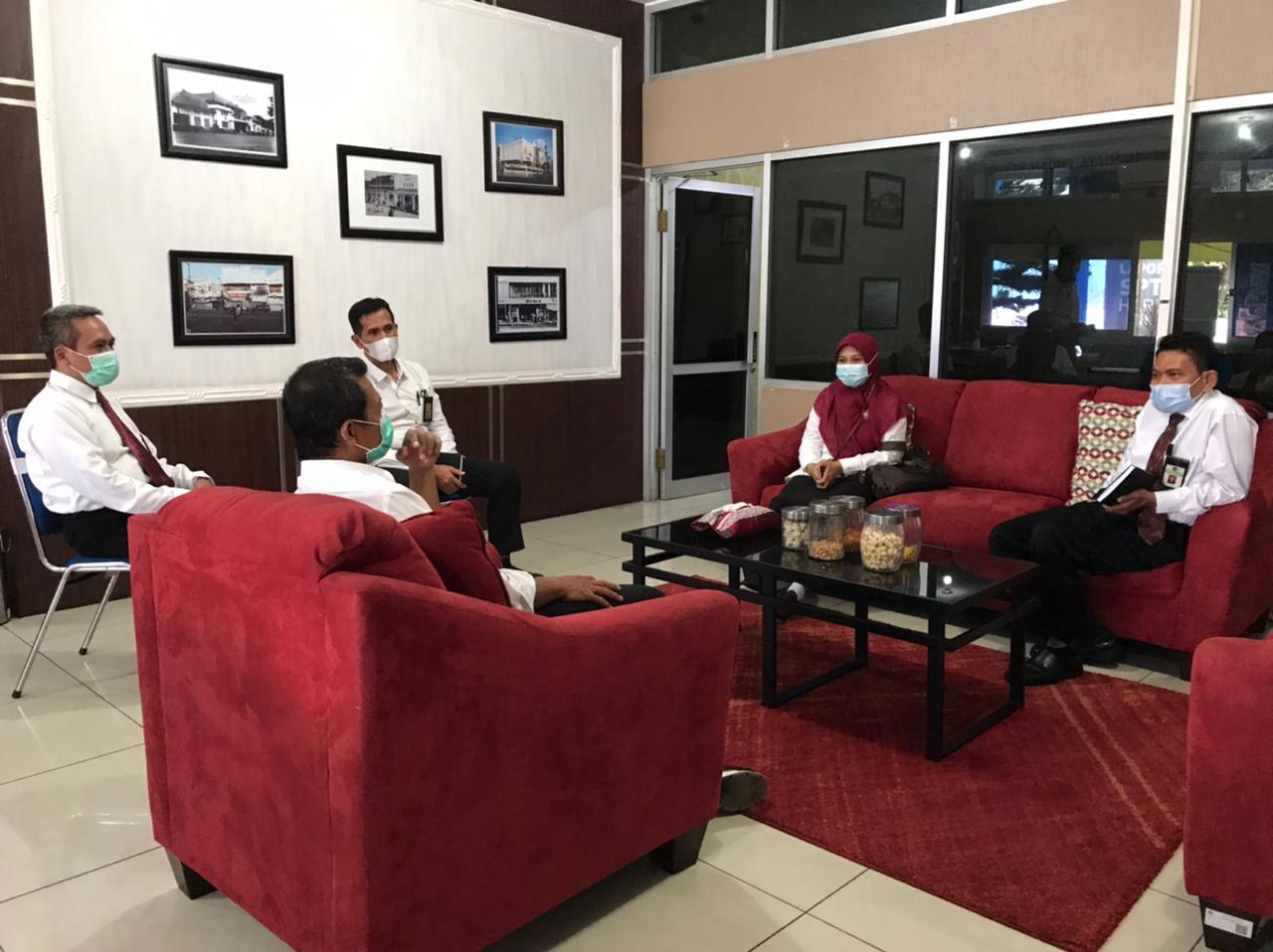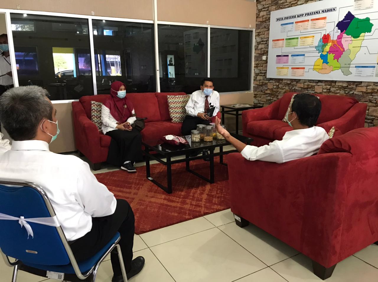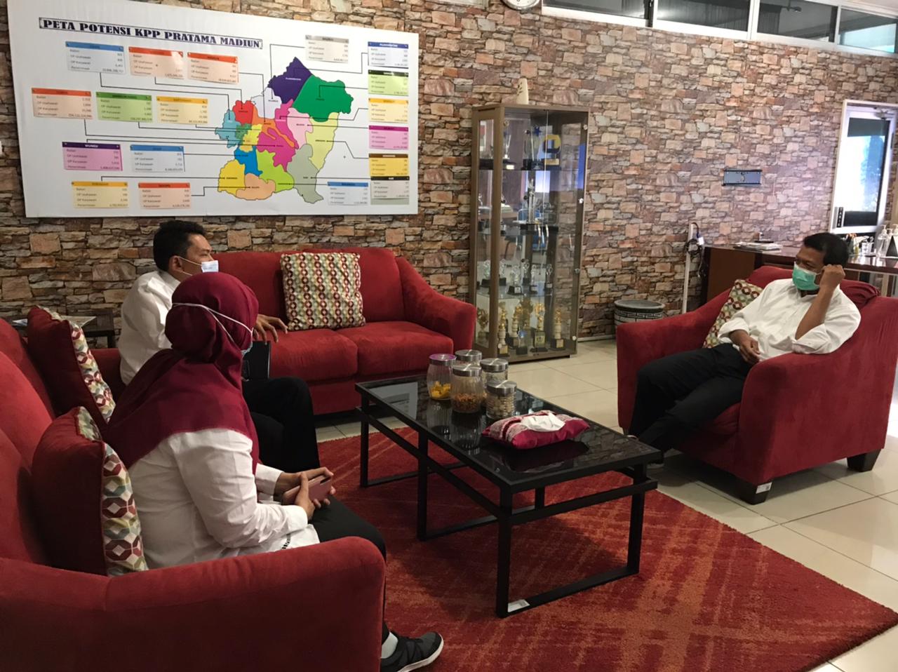 Kepala KPP Pratama Madiun Santoso Dwi Prasetyo menerima kunjungan kerja dari Kepala Kantor Pelayanan Kekayaan Negara dan Lelang (KPKNL) Madiun Adi Wibowo beserta staf di ruang kerjanya di Madiun (Senin, 26/4). Ikut hadir menyambut kunjungan tersebut Kepala Seksi Ekstensifikasi dan Penyuluhan Muhammad Azis Romadhoni dan Kepala Seksi Pelayanan KPP Pratama Madiun Hevy Sugeng Prayitno.