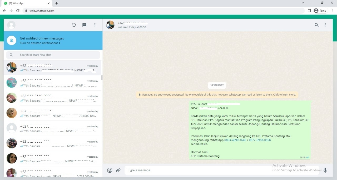 Kantor Pelayanan Pajak (KPP) Pratama Bontang mengirimkan Whatsapp Chat Blast kepada para wajib pajak untuk segera memanfaatkan Program Pengungkapan Sukarela (PPS) di Kota Bontang (Kamis, 16/06).