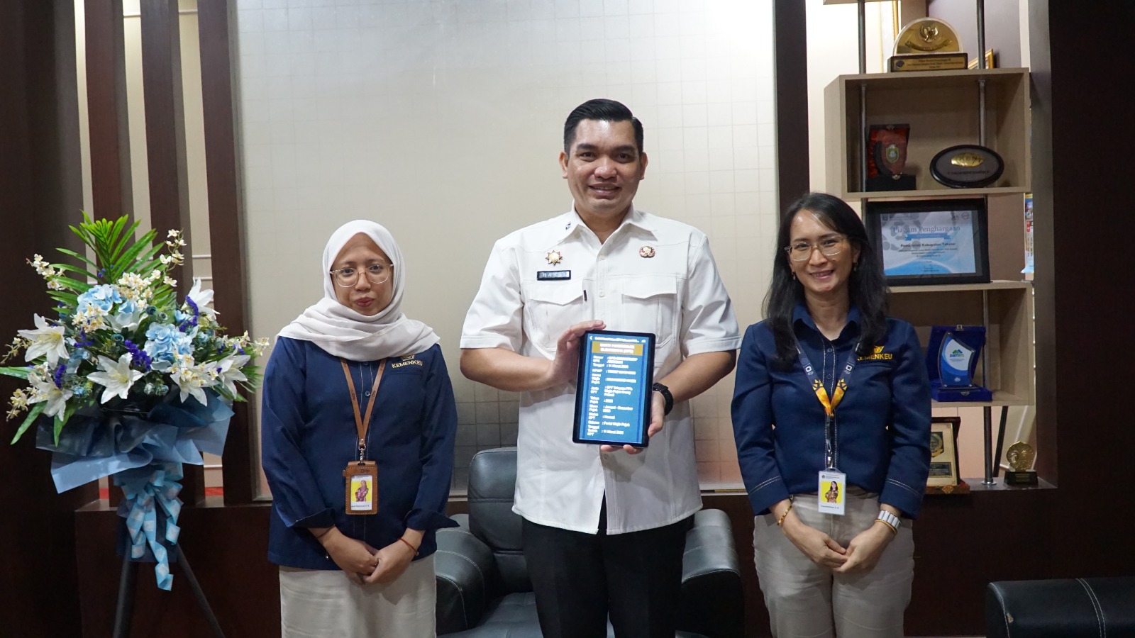 Kepala Kantor Pelayanan, Penyuluhan, dan Konsultasi Perpajakan (KP2KP) Takalar, Creschenthum Srimariastuti Boroh turut mendampingi Sekretaris Daerah (Sekda) Kabupaten Takalar, Muhammad Hasbi dalam melaporkan Surat Pemberitahuan (SPT) Tahunan di Ruang Kerja Sekda Kabupaten Takalar (Rabu, 11/3).