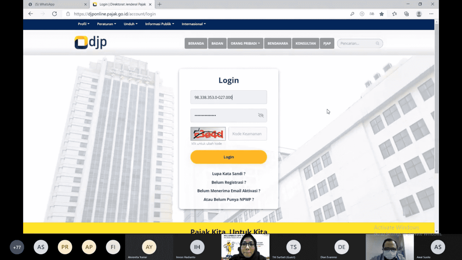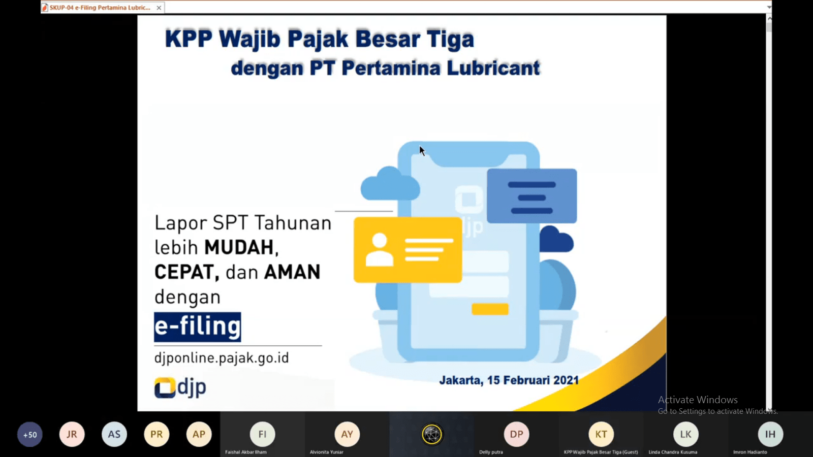 Acara dibuka oleh Bambang Setiawan selaku Plh. Kepala Seksi Pengawasan dan Konsultasi I (Waskon I) mewakili Kepala Kantor. dalam sambutannya Bambang mengucapkan terima kasih karena masih diberikan kesempatan untuk mendampingi pengisian SPT Tahunan di PT Pertamina Lubricants yang biasanya dilakukan secara langsung, dan sekarang secara daring, namun ini tidak mengurangi rasa keinginan kami untuk melayani kepentingan wajib pajak. Semoga seluruh karyawan di PT Pertamina Lubricants dapat memenuhi kewajiban perpajakan dengan baik.