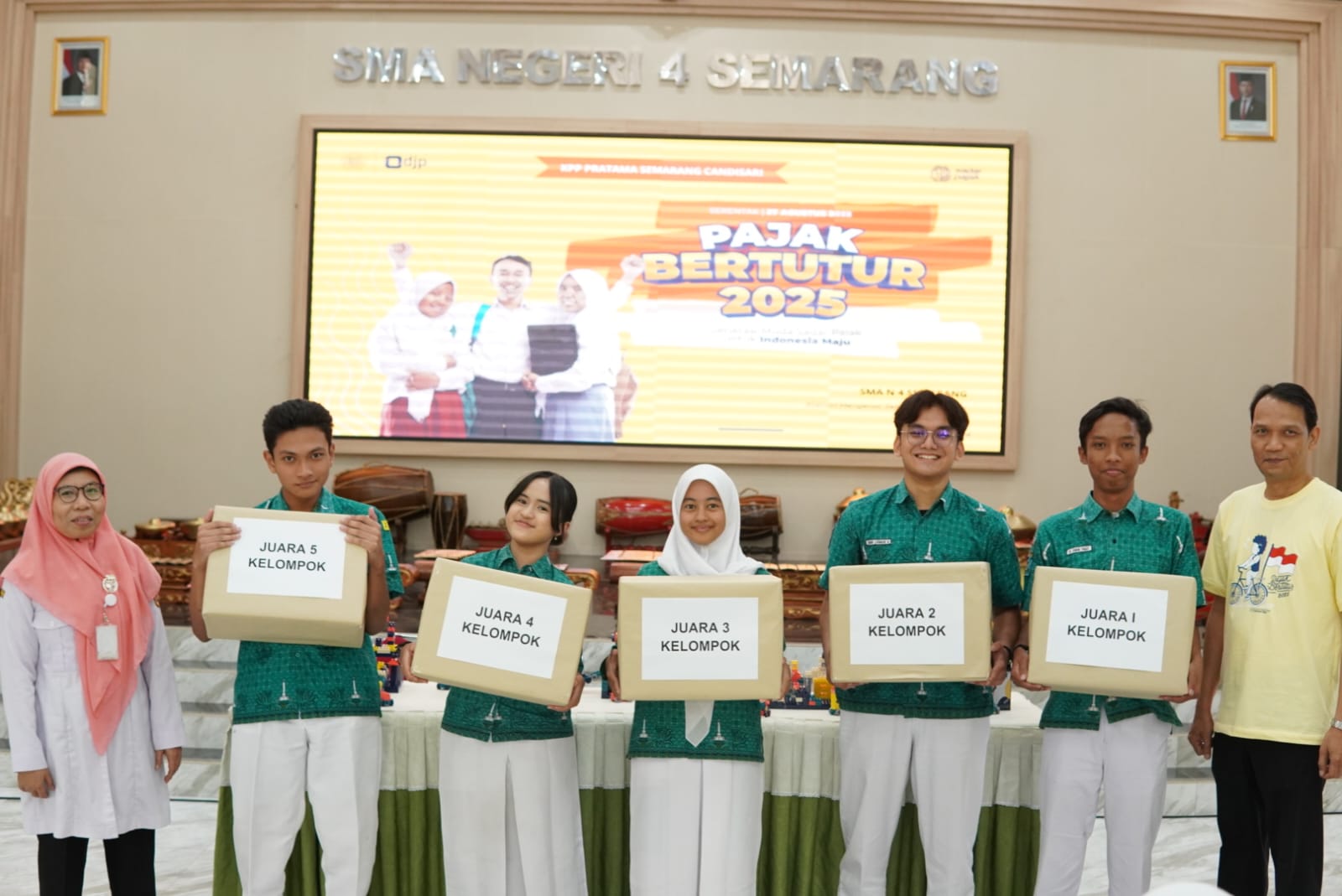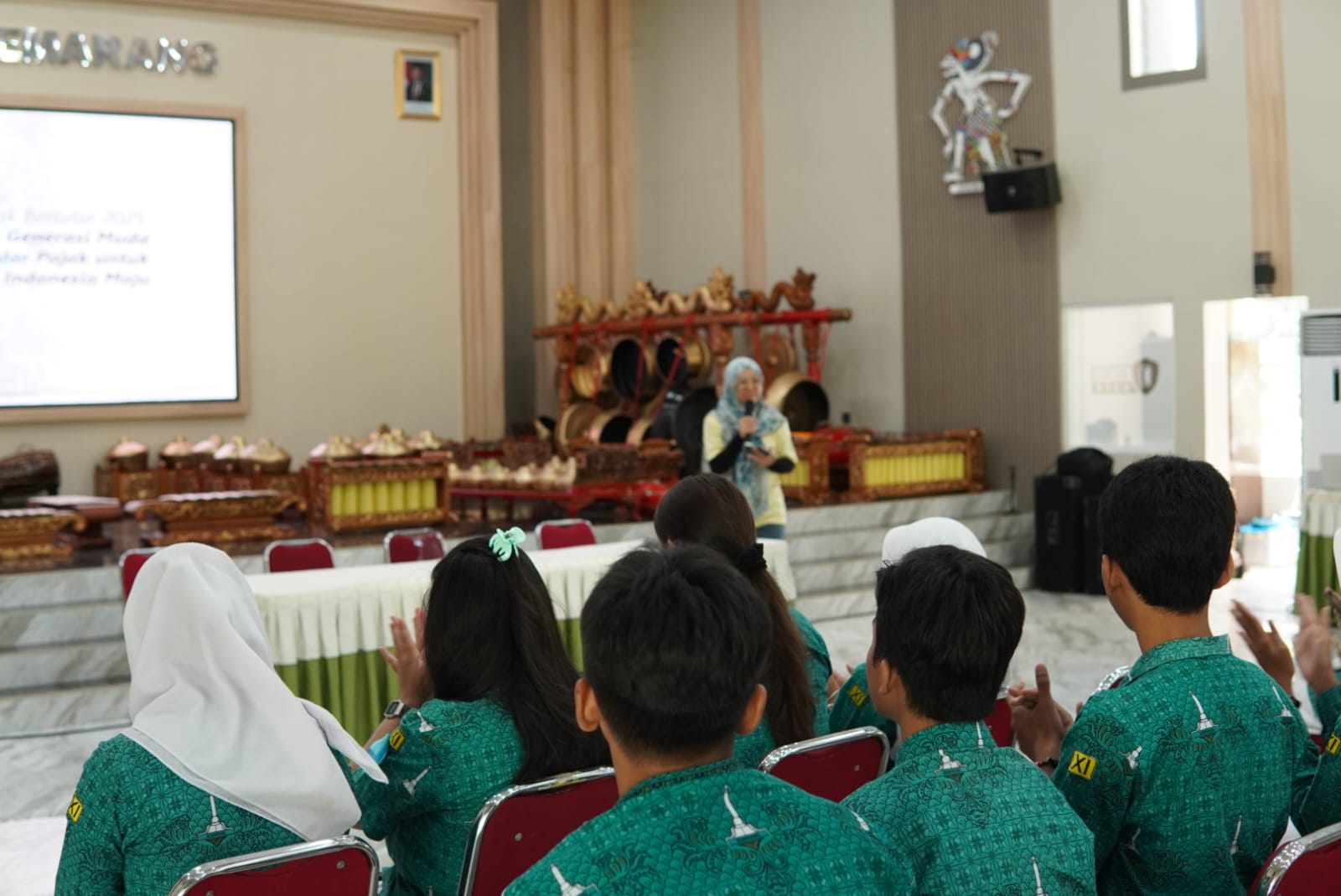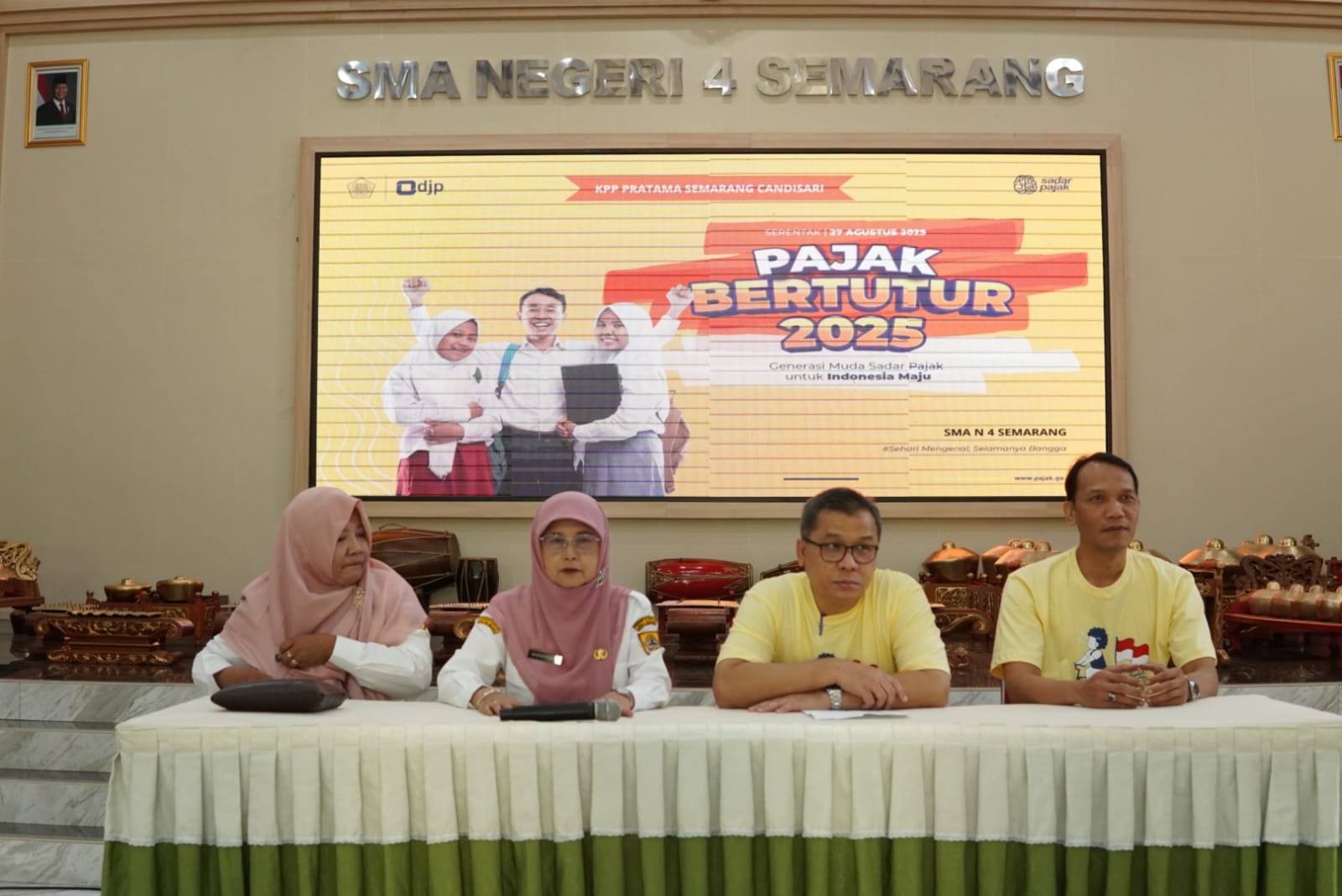 Kantor Pelayanan Pajak (KPP) Pratama Semarang Candisari gelar Pajak Bertutur 2025 bersama siswa/i Sekolah Menengah Atas (SMA) Negeri 4 Semarang untuk menanamkan kesadaran pajak bagi pelajar secara tatap muka pukul 08.20–11.00 di Aula SMAN 4 Semarang, Kota Semarang (Rabu, 27/08).