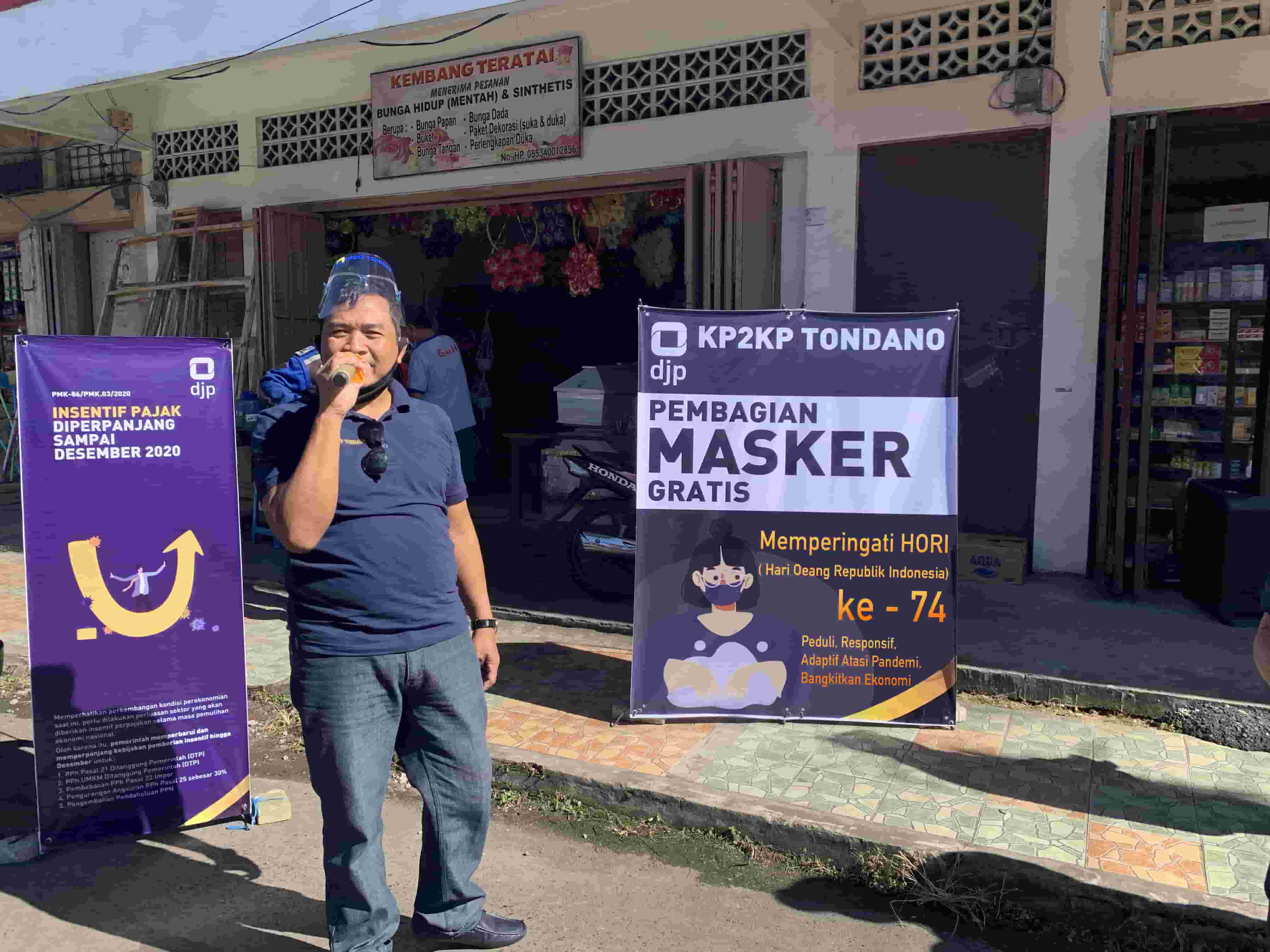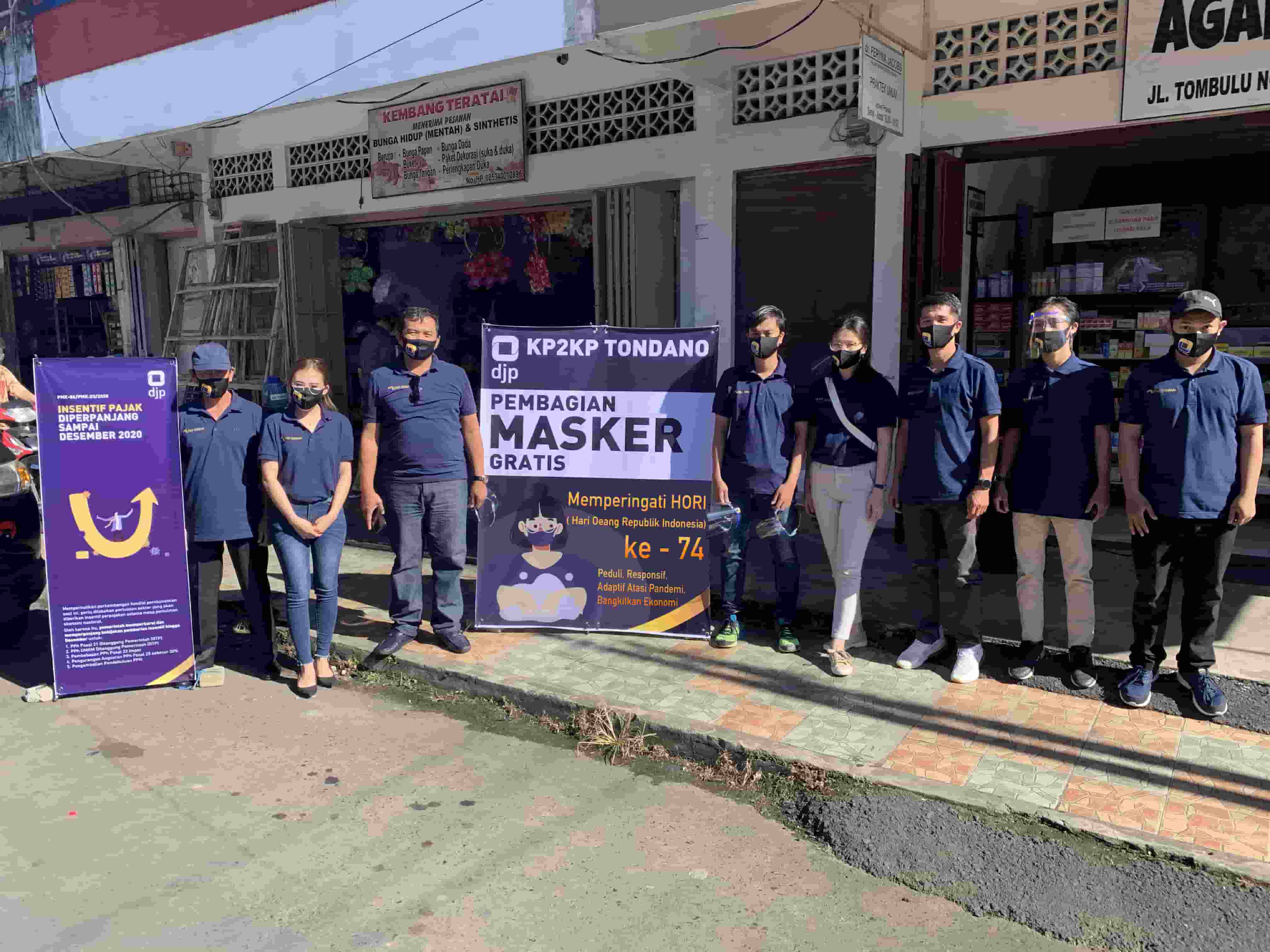 Kantor Pelayanan Penyuluhan dan Konsultasi Perpajakan (KP2KP) Tondano adakan pembagian masker gratis dalam rangka memperingati Hari Oeang Republik Indonesia (HORI) ke-74 (Jumat, 23/10). Kegiatan ini dilaksanakan di Kelurahan Wawalintouan Kec. Tondano Barat Kab. Minahasa.