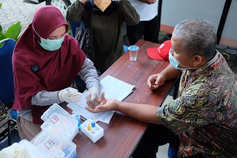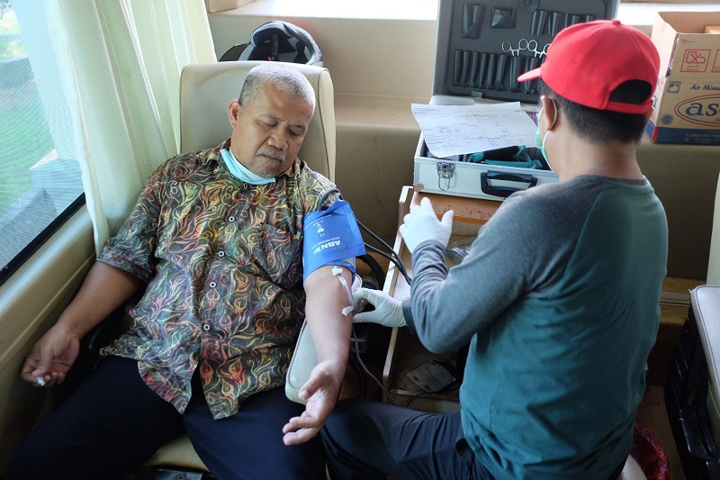 Dalam menjalankan tugasnya, pihak PMI menerapkan protokol kesehatan dengan menggunakan masker. Petugas juga mengganti sarung tangan medis setiap pergantian peserta donor darah.