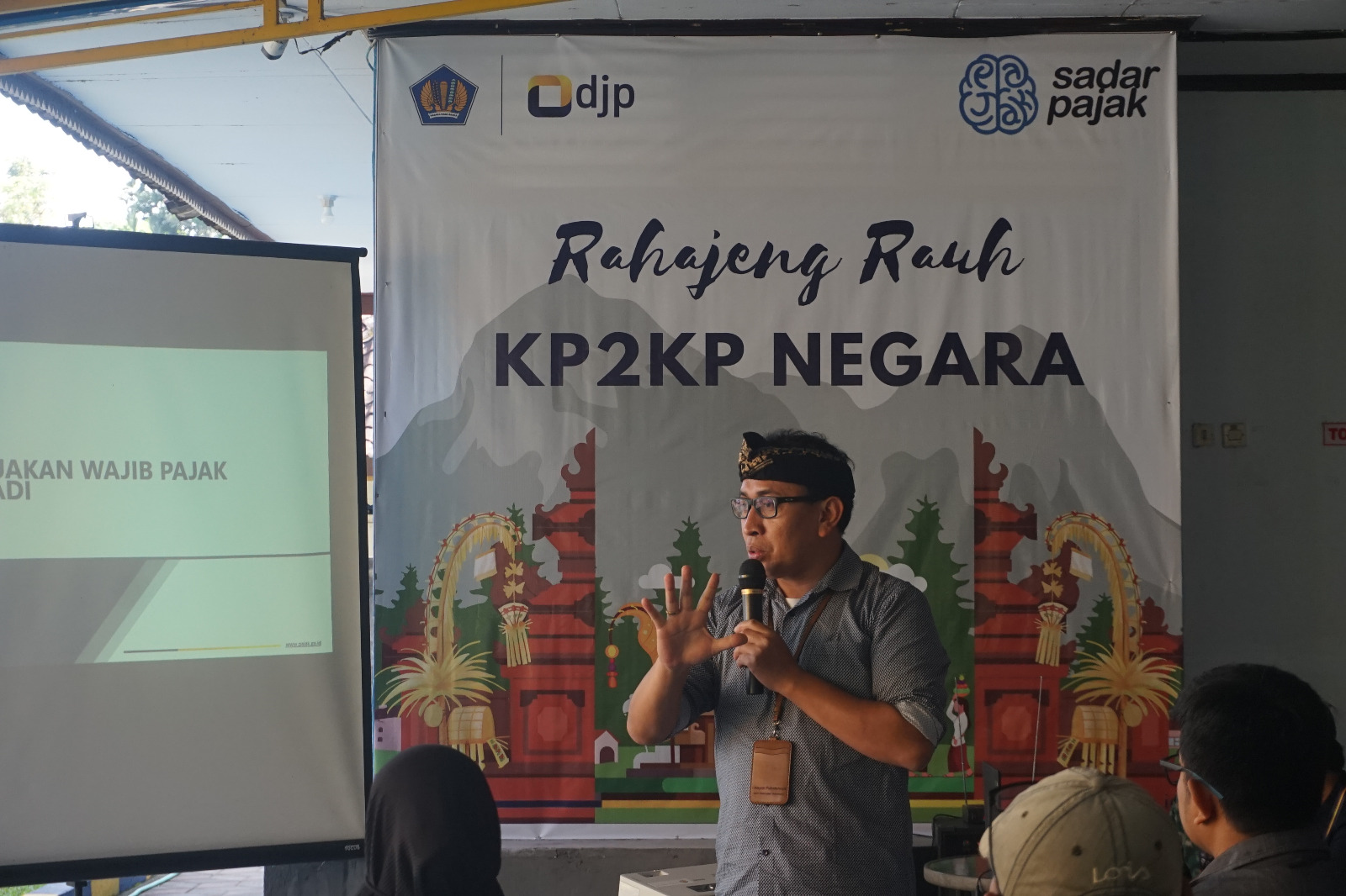 Gusti Putu Rizky Widyanata dan Muhammad Arif Luqman Syah selaku pelaksana KP2KP Negara menyampaikan materi Peraturan Pemerintah (PP) Nomor 23 Tahun 2018 yang diperbarui dengan PP Nomor 55 Tahun 2022 terkait fasilitas pembebasan pajak bagi Wajib Pajak Orang Pribadi (WPOP) usahawan/UMKM yang memiliki peredaran penghasilan bruto kurang dari 500 juta rupiah dalam setahun. Kemudian para wajib pajak dipandu untuk mengisi SPT Tahunan menggunakan formulir SPT 1770 yang dikhususkan untuk WP OP usahawan/pelaku UMKM.
