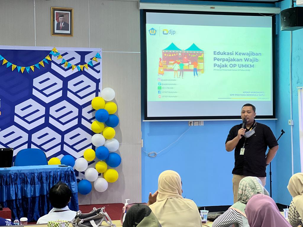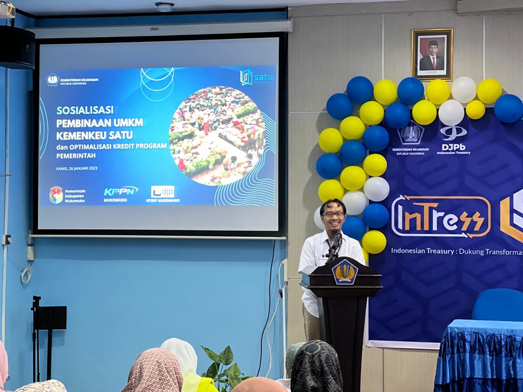 Kantor Pelayanan, Penyuluhan, dan Konsultasi Perpajakan (KP2KP) Mukomuko, bersinergi dengan Kantor Pelayanan Perbendaharaan Negara (KPPN) Mukomuko menyelenggarakan kegiatan Sosialisasi Pembinaan Usaha Mikro Kecil dan Menengah (UMKM) Kemenkeu Satu dan Optimalisasi Kredit Program Pemerintah di Aula KPPN Mukomuko, Kabupaten Mukomuko (Kamis, 26/1).