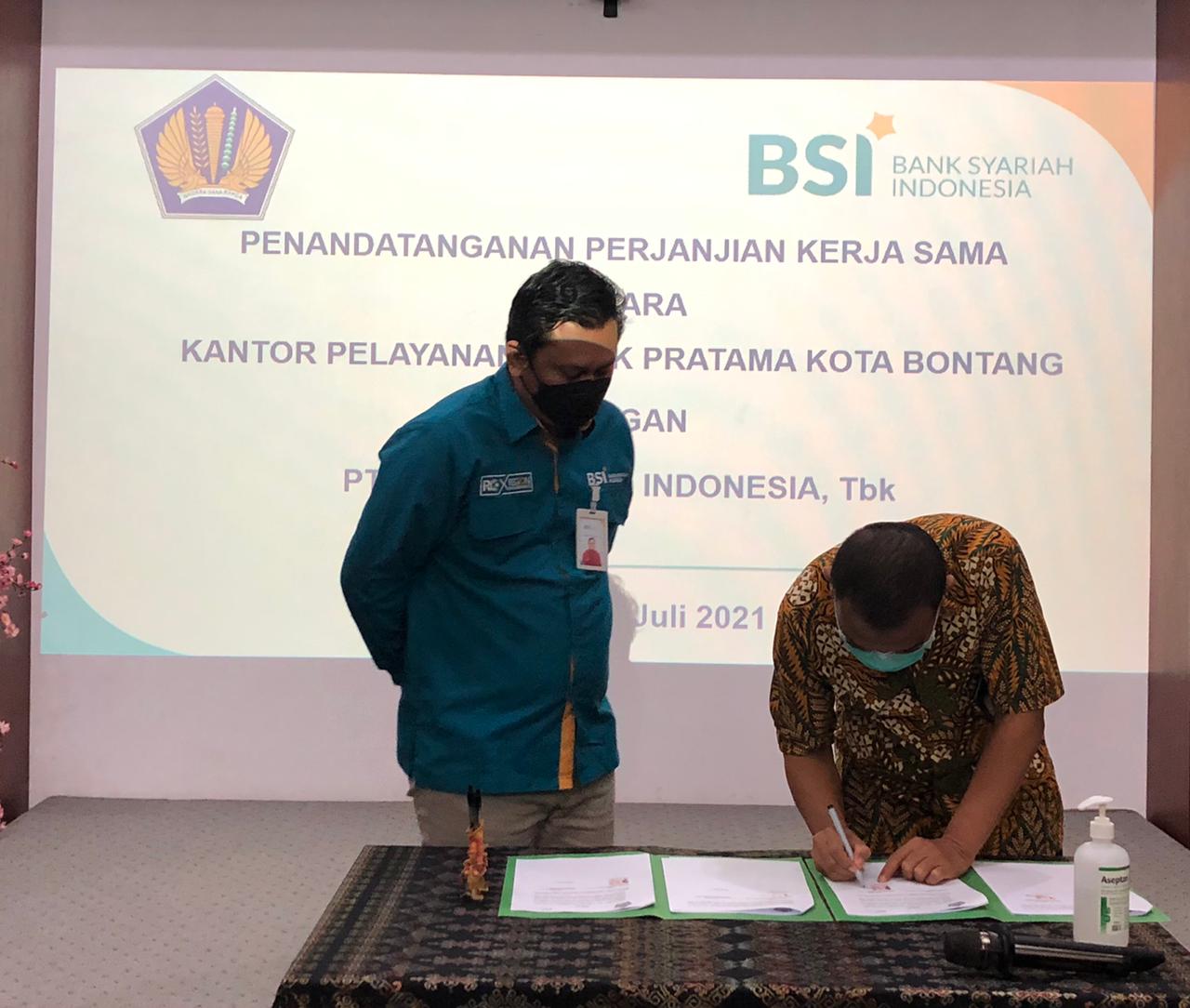 Kantor Pelayanan Pajak (KPP) Pratama Bontang dan Bank Syariah Indonesia (BSI) Cabang Bontang melakukan penandatanganan Perjanjian Kerja Sama (PKS) terkait pembiayaan Mitraguna Berkah di ruang IHT KPP Pratama Bontang, Bontang, Kalimantan Timur (Kamis, 1/7).