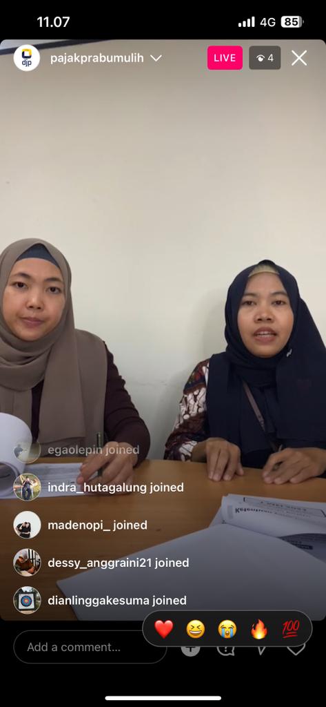 Saat live IG berlangsung beberapa wajib pajak yang mengajukan pertanyaan melalui kolom komentar. Bagi wajib pajak yang tidak sempat mengikuti live IG ini, wajib pajak masih dapat berkonsultasi melalui Whatsapp dan Instagram atau datang langsung ke KPP Pratama Prabumulih.