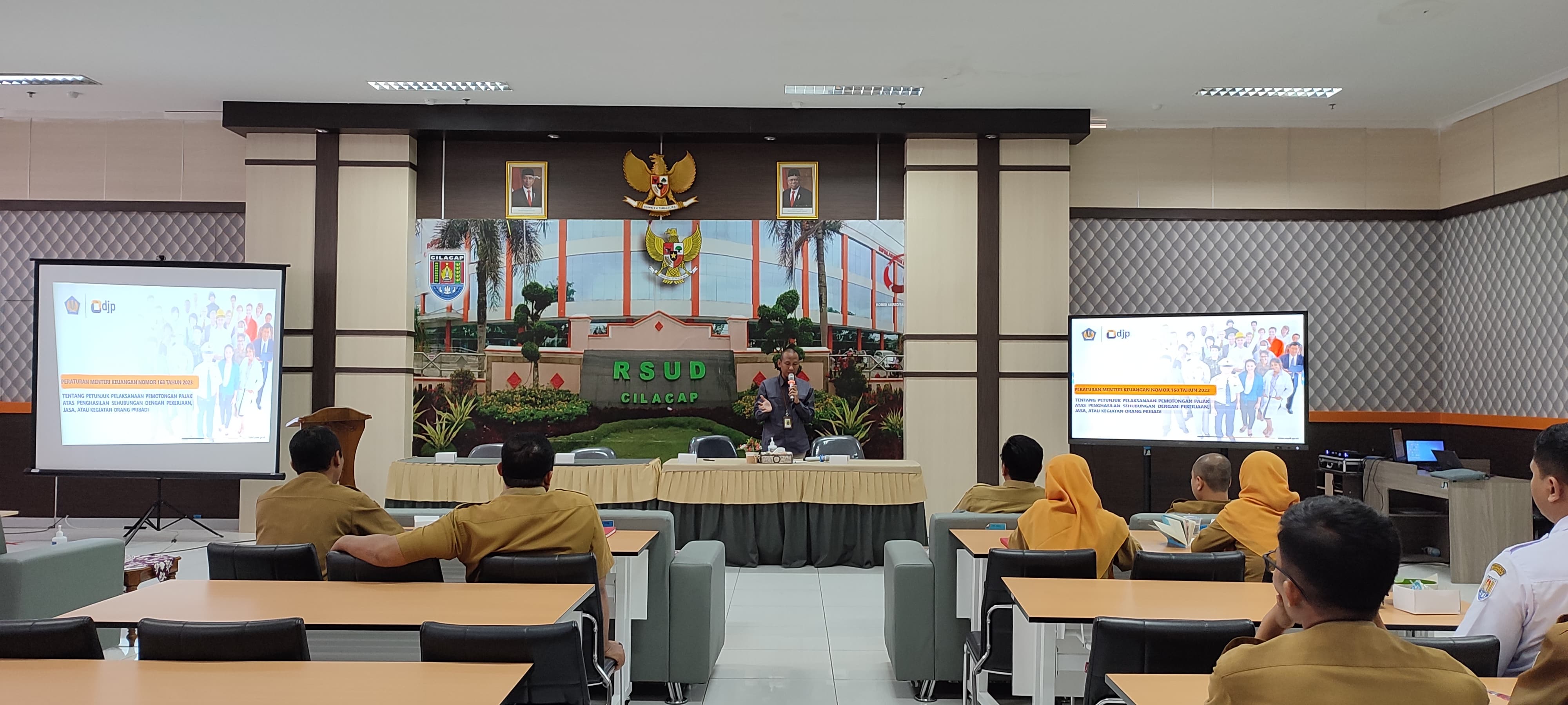 Kantor Pelayanan Pajak (KPP) Pratama Cilacap bersama Rumah Sakit Umum Daerah (RSUD) Cilacap mengadakan sosialisasi mengenai Peraturan Menteri Keuangan (PMK) Nomor 168 Tahun 2023 tentang Petunjuk Pelaksanaan Pemotongan Pajak atas Penghasilan Sehubungan dengan Pekerjaan, Jasa, atau Kegiatan Orang Pribadi. PMK ini merupakan peraturan pelaksanaan dari Peraturan Pemerintah (PP) Nomor 58 Tahun 2023 (Selasa, 17/9). Sosialisasi dilaksanakan secara tatap muka yang melibatkan pegawai organik maupun nonorganik RSUD Cilacap di Aula Pertemuan Lantai 3 RSUD Cilacap.