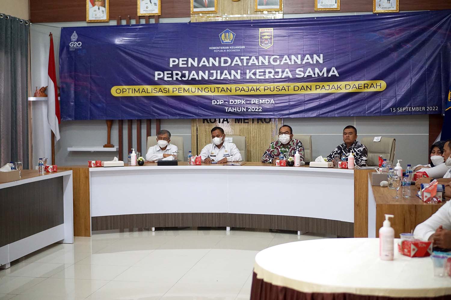 Wali Kota Metro yang diwakilkan oleh Wakil Wali Kota Metro, Qomaru Zaman dan perwakilan dari Kantor Pelayanan Pajak (KPP) Pratama Metro menandatangani Perjanjian Kerja Sama (PKS) dalam rangka optimalisasi pemungutan pajak pusat dan pajak daerah bertempat di Aula Pemerintah Kota Metro, Metro (Kamis,15/9).