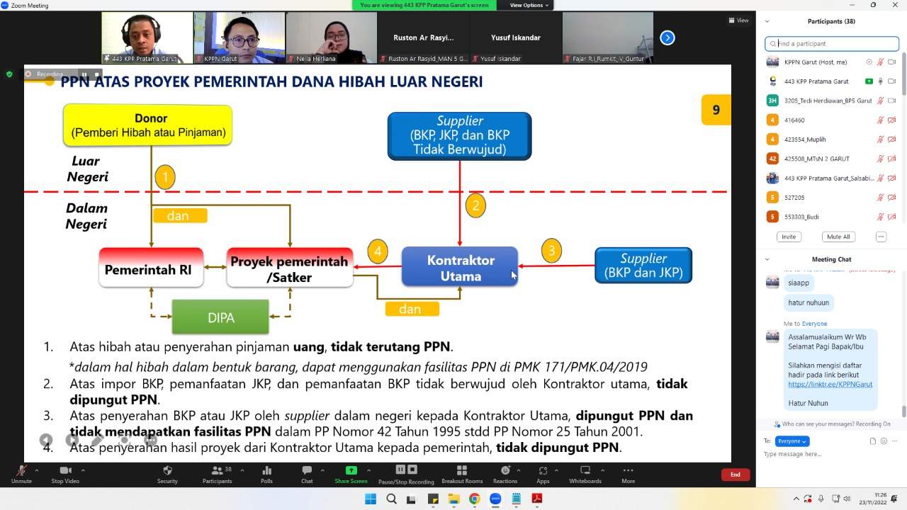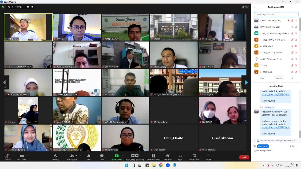Kantor Pelayanan Pajak (KPP) Pratama Garut dan Kantor Pelayanan Perbendaharaan Negara (KPPN) berkolaborasi menyelenggarakan sosialisasi perpajakan kepada Bendahara Mitra Satuan Kerja Instansi Pemerintah Vertikal melalui Zoom Meeting di Kabupaten Garut (Rabu, 23/11).