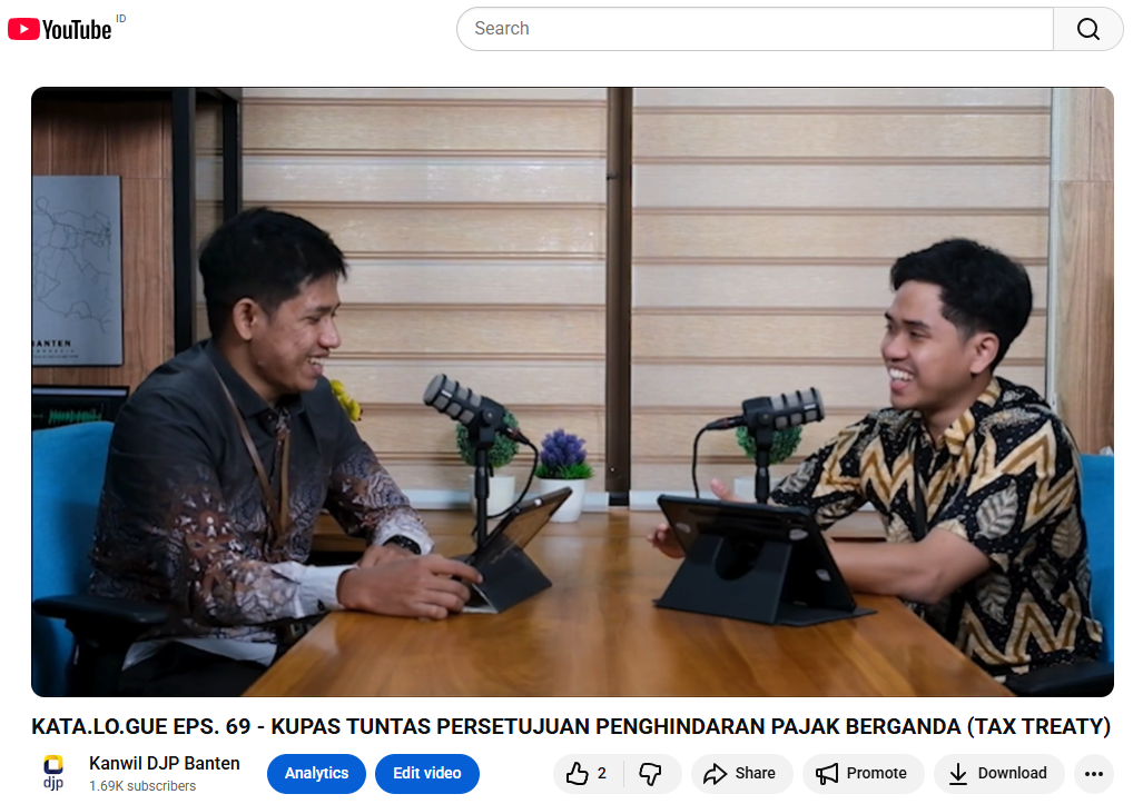 Kantor Wilayah Direktorat Jenderal Pajak (Kanwil DJP) Banten kembali menghadirkan episode terbaru siniar bertema edukasi pajak, yaitu "Katalogue" yang kali ini membahas perjanjian penghindaran pajak berganda (P3B) atau tax treaty. Siniar ini adalah episode ke-69 yang tayang di kanal resmi Youtube Kanwil DJP Banten (Jumat, 17/10).