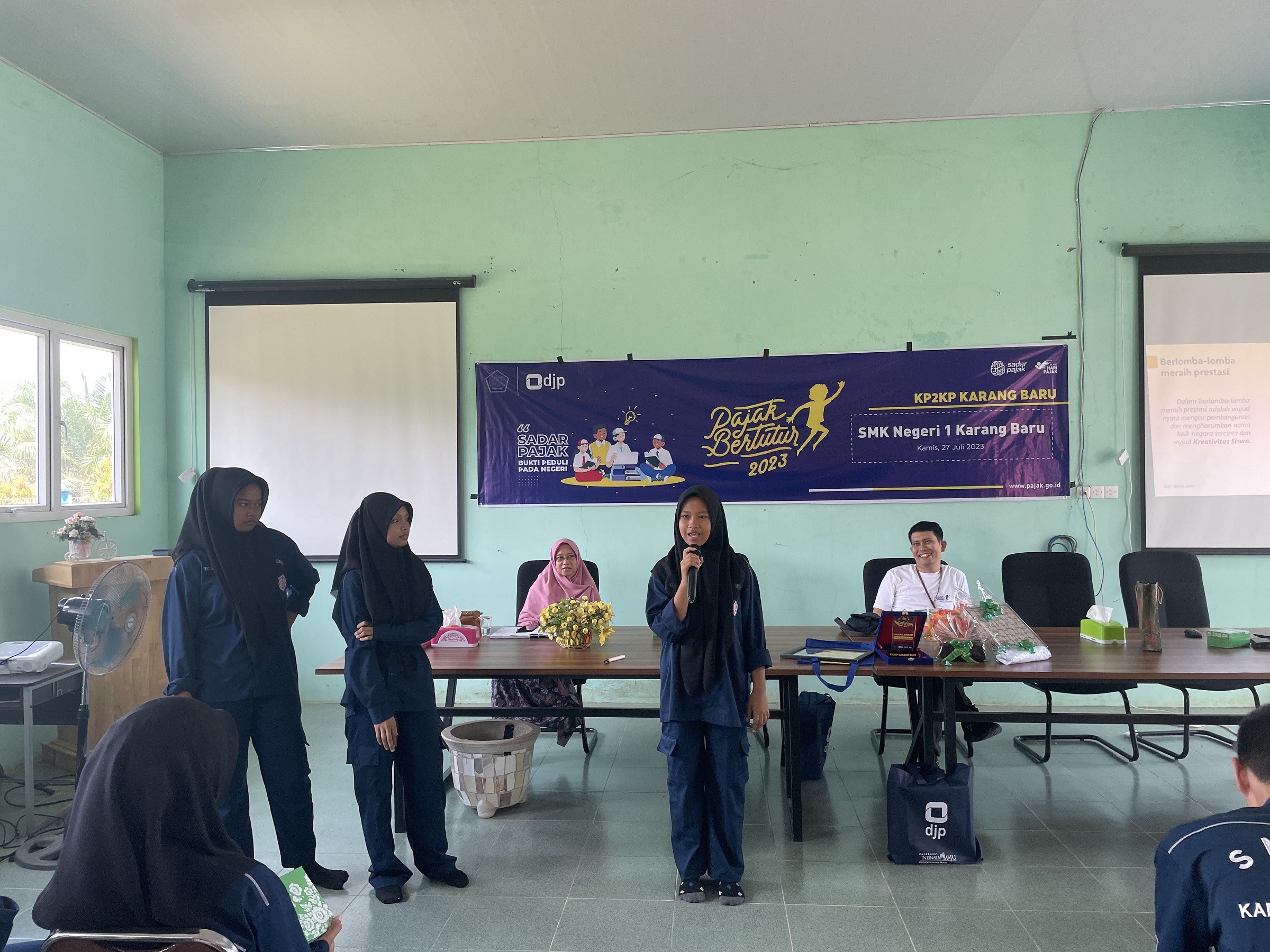 Kantor Pelayanan, Penyuluhan, dan Konsultasi Perpajakan (KP2KP) Karang Baru melaksanakan Pajak Bertutur 2023 di SMK Negeri 1 Karang Baru, Aceh (Kamis, 27/7). Kegiatan ini diikuti oleh 46 siswa-siswi SMK Negeri 1 Karang Baru dengan mengambil tema “Sadar Pajak, Bukti Peduli Pada Negeri”.