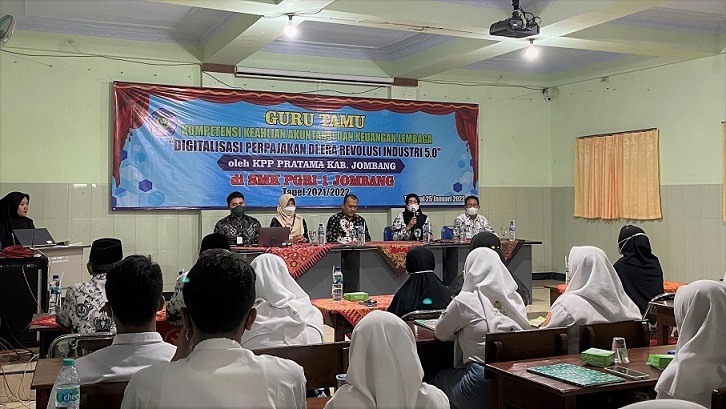 Kantor Pelayanan Pajak (KPP) Pratama Jombang mengajak 120 siswa kelas XII SMK PGRI 1 Jombang belajar tentang pajak saat mengisi acara Guru Tamu dengan tema “Digitalisasi Perpajakan di Era Revolusi Indutstri 5.0” (Selasa, 25/1).