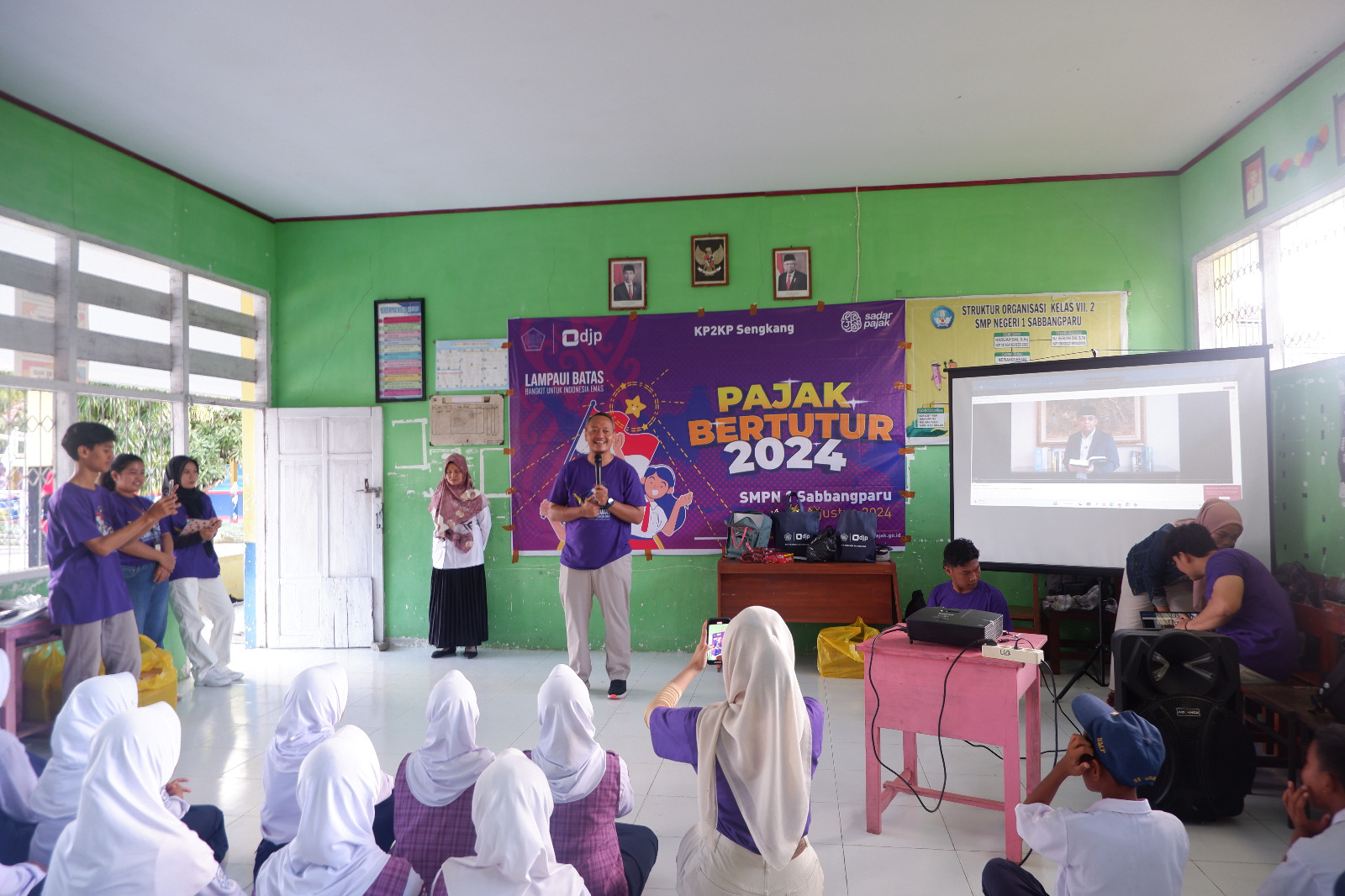 KP2KP Sengkang sebagai salah satu unit vertikal DJP turut serta melaksanakan kegiatan Pajak Bertutur 2024 di SMP Negeri 1 Sabbagparu, Sompe, Sabbang Paru, Tolotenreng, Wajo, Kabupaten Wajo (Rabu, 7/8). Kegiatan tersebut dimulai pada pukul 08:15 WITA yang dihadiri oleh para guru, dan 36 peserta dari seluruh perwakilan kelas VII, VIII, dan IX.