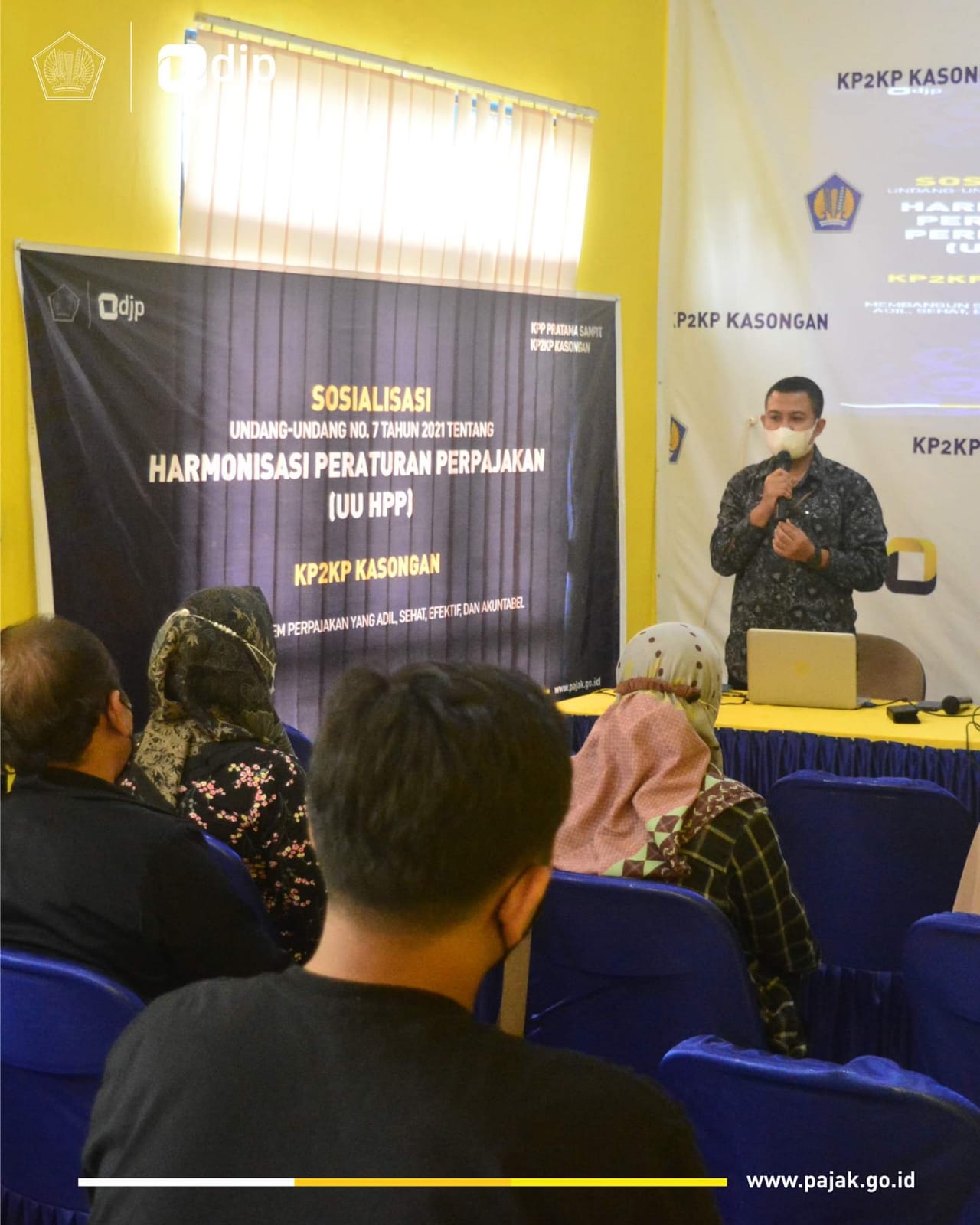 Kantor Pelayanan, Penyuluhan, dan Konsultasi Perpajakan (KP2KP) Kasongan menggelar Sosialisasi Undang-Undang Harmonisasi Peraturan Perpajakan dengan mengundang para pegiat UMKM di Wilayah Kabupaten Katingan secara tatap muka dengan protokol kesehatan bertempat back office KP2KP Kasongan (Selasa, 16/11).